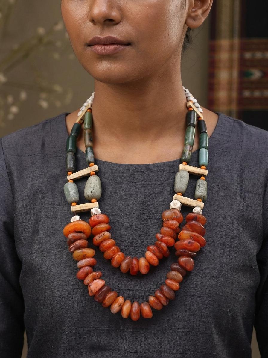 The necklace presents a visually arresting composition, featuring a vibrant cascade of amber-hued stones interspersed with cool, jade-like beads. Strategically placed bone-colored accents and tiny, bright orange spacers add a dynamic rhythm to the design. Its 13-inch length allows it to rest elegantly on the collarbone, drawing attention to your neckline with sophisticated flair.