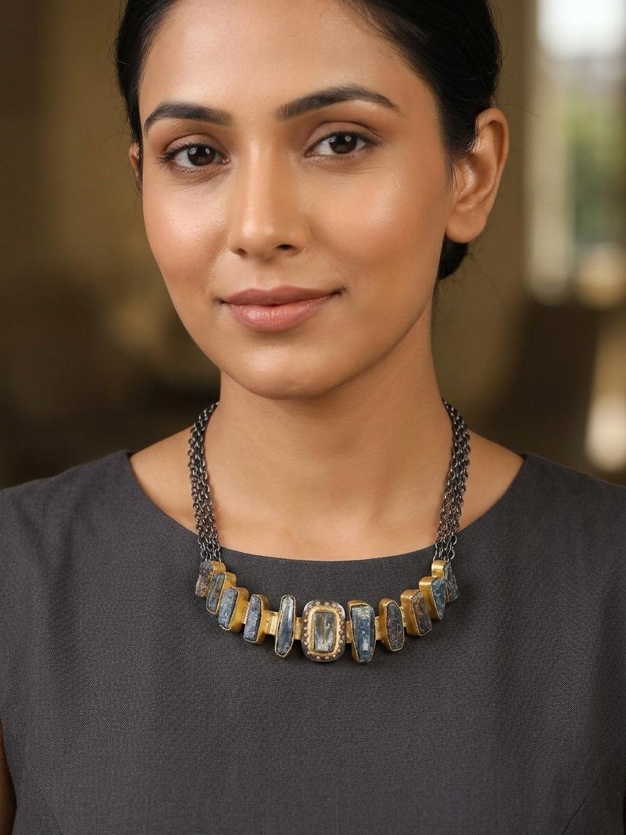 Each element is a careful composition, meticulously crafted by skilled hands. The rich, warm embrace of solid brass serves as the foundation, hand-worked to embrace the unique character of each raw stone. The dual-layered chain, with its dark, antiqued finish, provides a striking contrast, hinting at a rich, tactile experience. This piece is born from a dedication to traditional techniques and an appreciation for the imperfect beauty found in nature's own creations.
