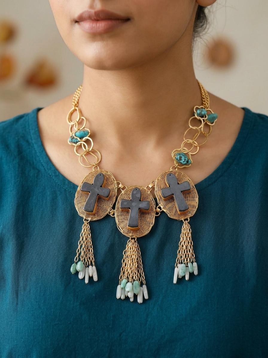 Dominating the design are three substantial, cross-shaped pendants, carved from a deep, charcoal-hued stone that offers a profound visual contrast. These are suspended within delicate, oval wire cages, further enhanced by cascading chains that culminate in a playful arrangement of raw, semi-precious stones in shades of aquamarine and clear quartz. The necklace itself is artfully constructed from a substantial brass chain, featuring organic, interlocking links interspersed with small clusters of vibrant turquoise, creating a dynamic and visually engaging composition. The overall length, measuring 15 inches with a front drop extending approximately 9.6 inches, ensures it rests beautifully against the décolletage.