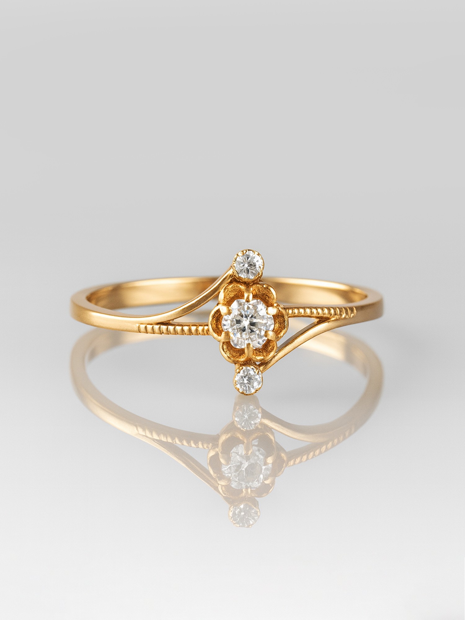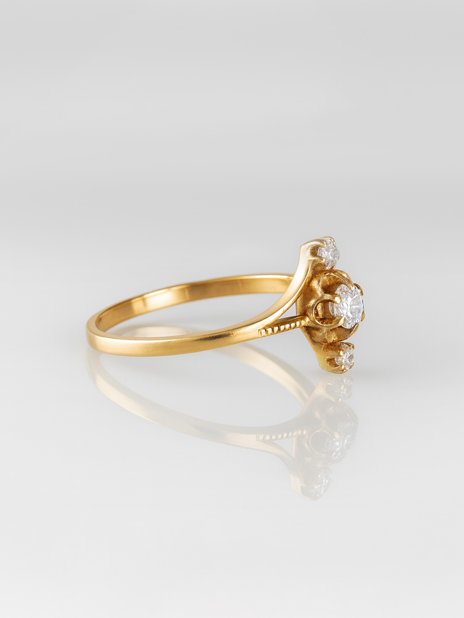 The Triple Diamond Gold Ring is a symbol of refined beauty, cast in the radiance of 18-karat gold. This ring features a trio of sparkling diamonds, each one set to catch the light and draw the eye. The central diamond, slightly larger, is flanked by two smaller companions, creating a harmonious and balanced design. This delicate arrangement represents the past, present, and future, making this ring a deeply meaningful gift for special occasions. The slender gold band, with its polished surface, allows the brilliance of the diamonds to take center stage. It’s a classic and versatile piece, embodying both luxury and simplicity, and is perfect for someone who appreciates understated elegance.