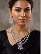 The necklace boasts a stunning three-layered design, each tier meticulously crafted with delicate floral patterns formed from sparkling stones. The layers cascade gracefully, creating a visually appealing and luxurious effect. The centerpiece of the necklace features prominent stones set within an intricate stone studded design, drawing the eye and adding a touch of vibrant colour. Each stone is carefully selected and precisely set to maximize its brilliance, creating a captivating and eye-catching display.