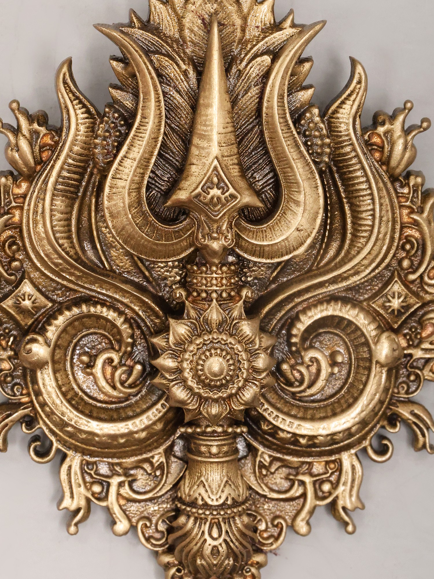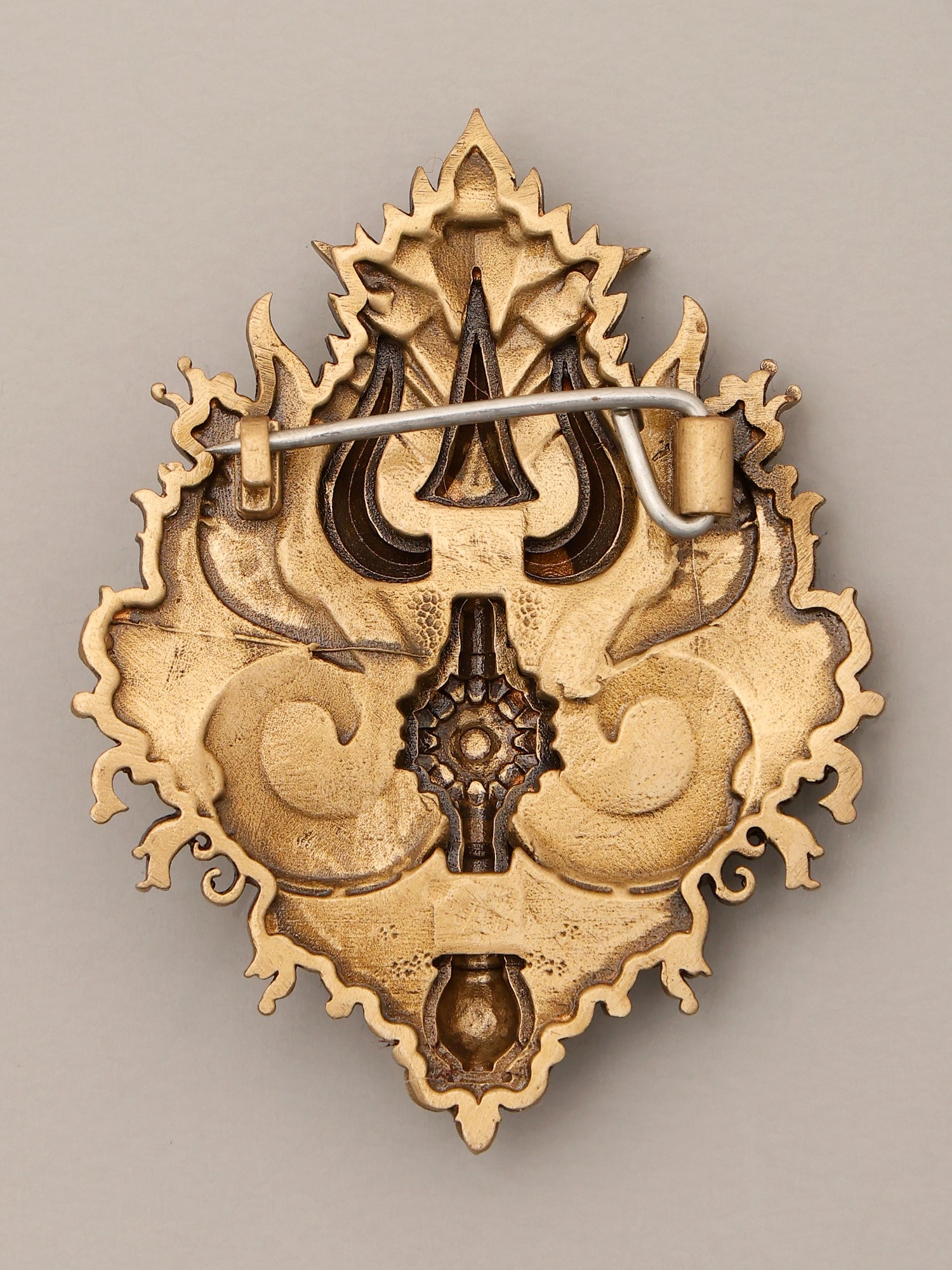 The brooch is made of brass, ensuring durability and a lasting shine. The metal has been carefully worked to capture the essence of the design. The raised elements and detailed carvings create a captivating three-dimensional effect that draws the eye and invites closer inspection. Each curve and line is thoughtfully rendered, resulting in a piece that is both aesthetically pleasing and deeply symbolic. It balances eye-catching design with a size appropriate for various garments and accessories.