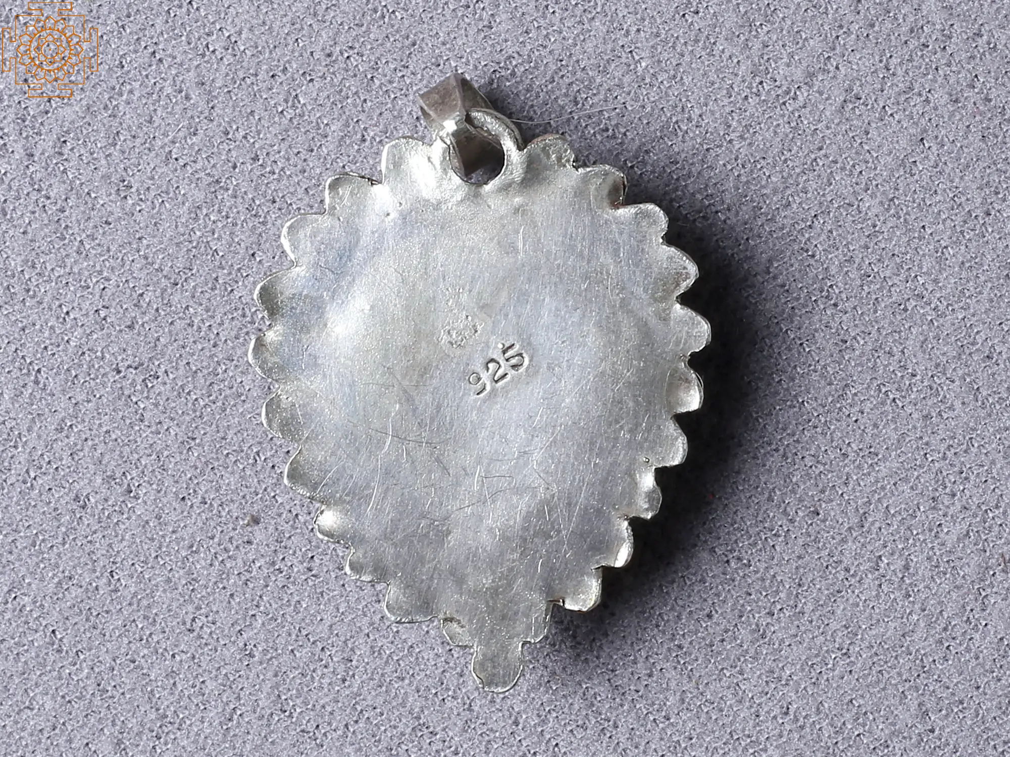 This Nepalese Turquoise Blue Silver Pendant is a striking piece of jewelry fashioned of gleaming Sterling Silver and complemented by a large teardrop-shaped Lapis Lazuli. The stone is contained within a lotus petal frame, with three red stone dots at the bottom to complete the appearance. This pendant is a piece of jewelry that may be elevated to the level of a collection and passed down as an heirloom to the next generation.