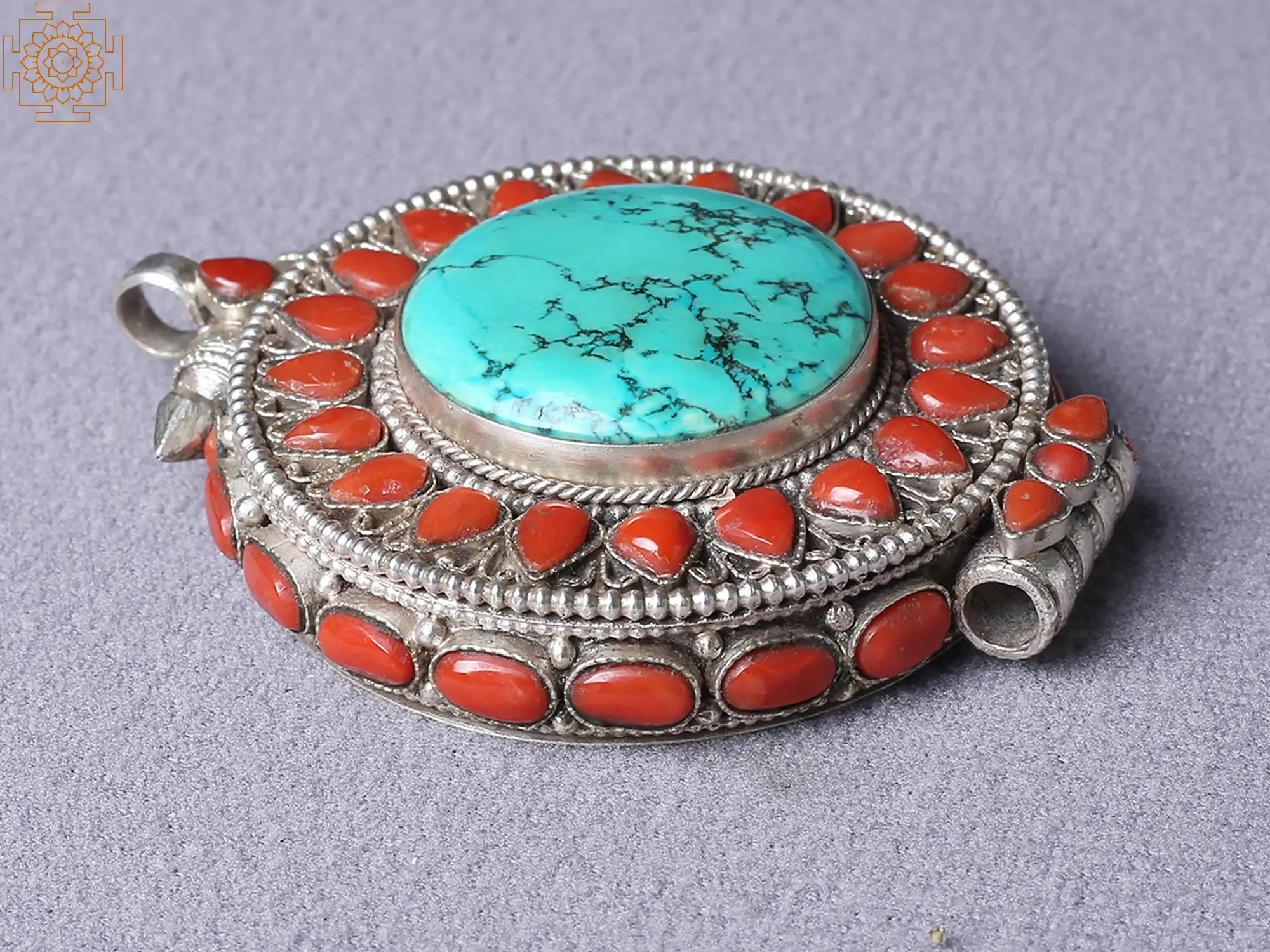 This Turquoise Coral Stone Ghau Pendant is a beautiful piece of jewelry that carries the peaceful energy of Turquoise which is associated with water and the fiery energy of the Red Corals. The face of the pendant is beautifully decorated with a big central turquoise stone surrounded by small red corals arranged in the form of a flower. Silver wires are used to make floral motifs around the coral petals.