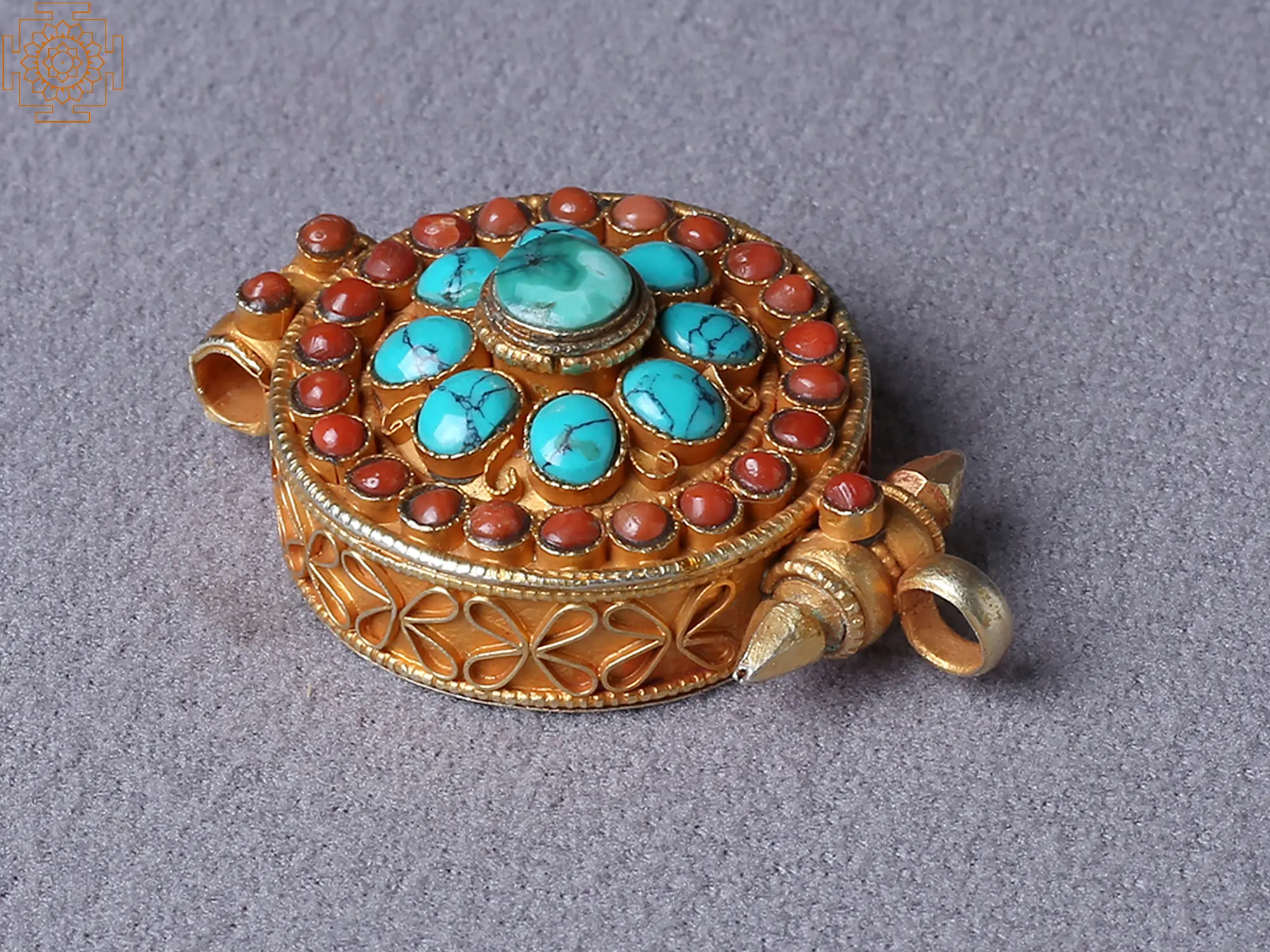 The Ghau pendants are sacred amulets specially constructed to carry prayer scrolls inside them. History says the Ghau were big amulets that would carry scrolls and sacred objects but then they were also constructed in smaller sizes resembling pendants but had the same role to play. They were devised to provide the wearer with blessings and protect them from negative energy. This Ghau pendant is a traditional piece with turquoise and red stone decorations on its face assisted with floral motifs.