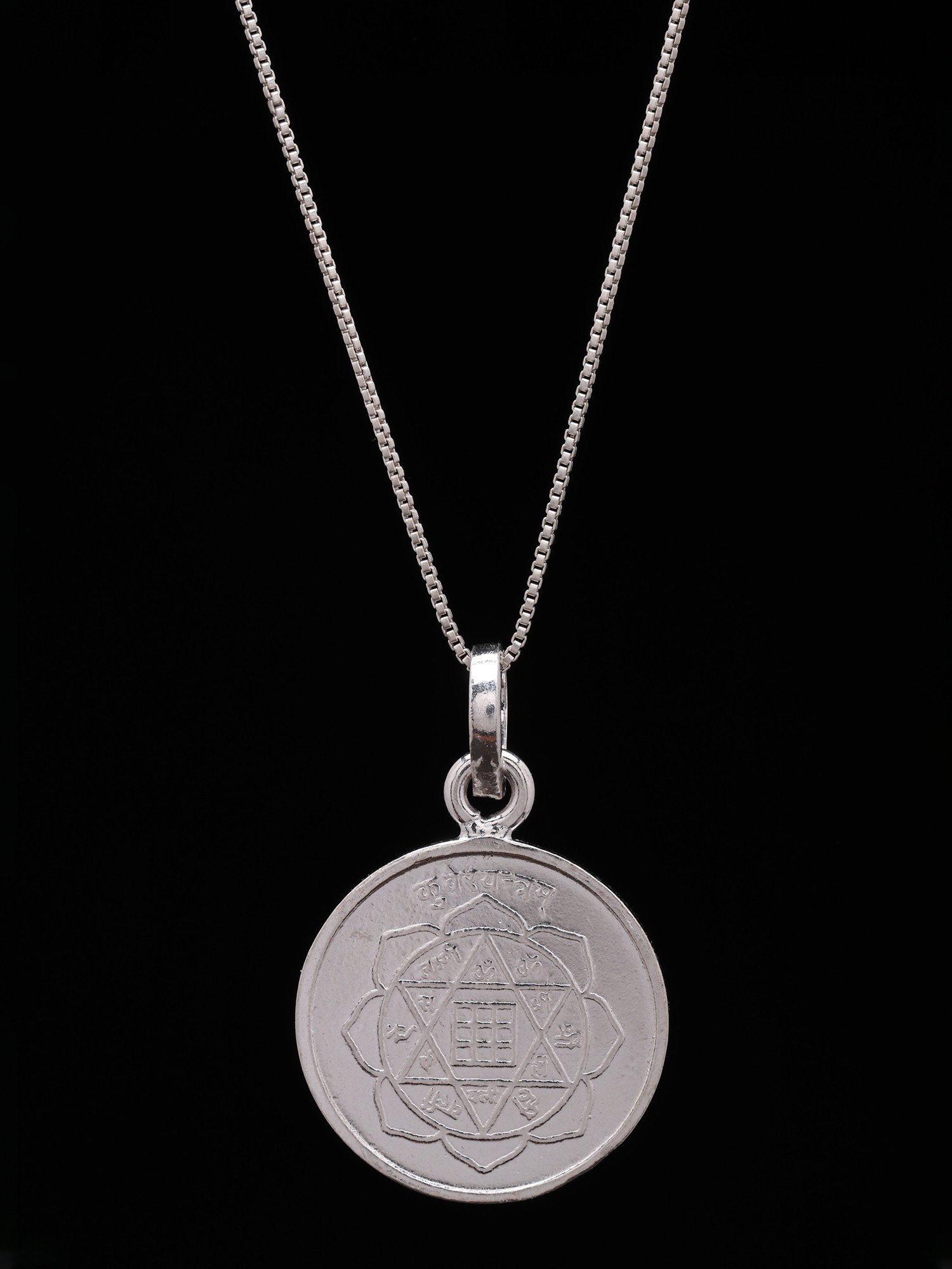 Wearing this pendant is believed to activate the benevolent energies of Kubera and the auspicious vibrations of the Yantra, creating a conduit for positive financial flow and overall well-being. It serves as a constant reminder of the universal principles of abundance and the potential for manifesting prosperity in one's life. Whether as a personal talisman, a meaningful gift, or a beautiful piece of silver jewelry, this Kubera pendant embodies tradition, spirituality, and the enduring pursuit of a prosperous and fulfilling life. Its classic design ensures it will be a treasured possession for years to come.
