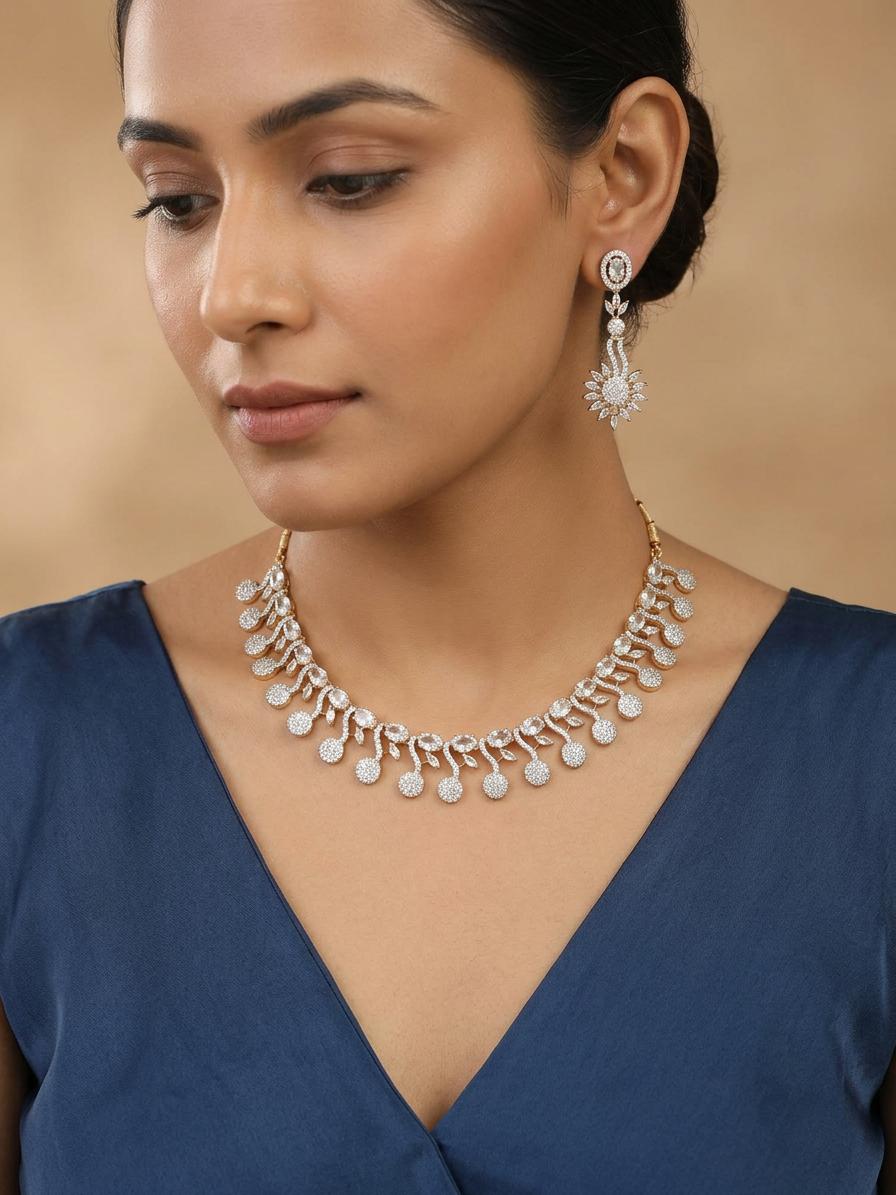 Attractive Floral Design Stone Studded American Diamond Necklace Set With Earrings