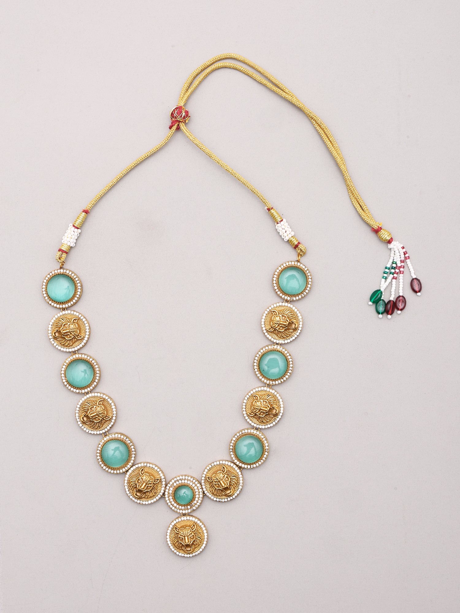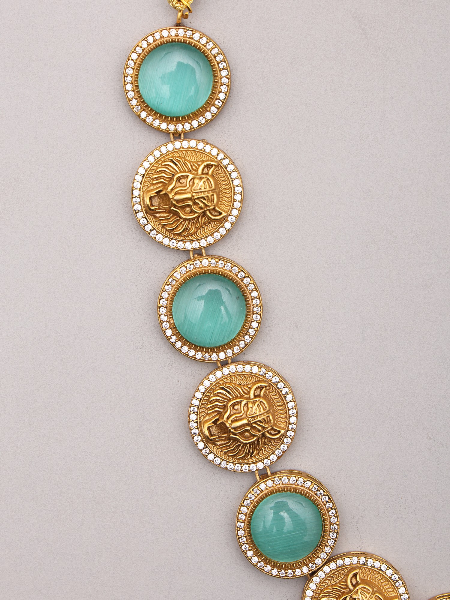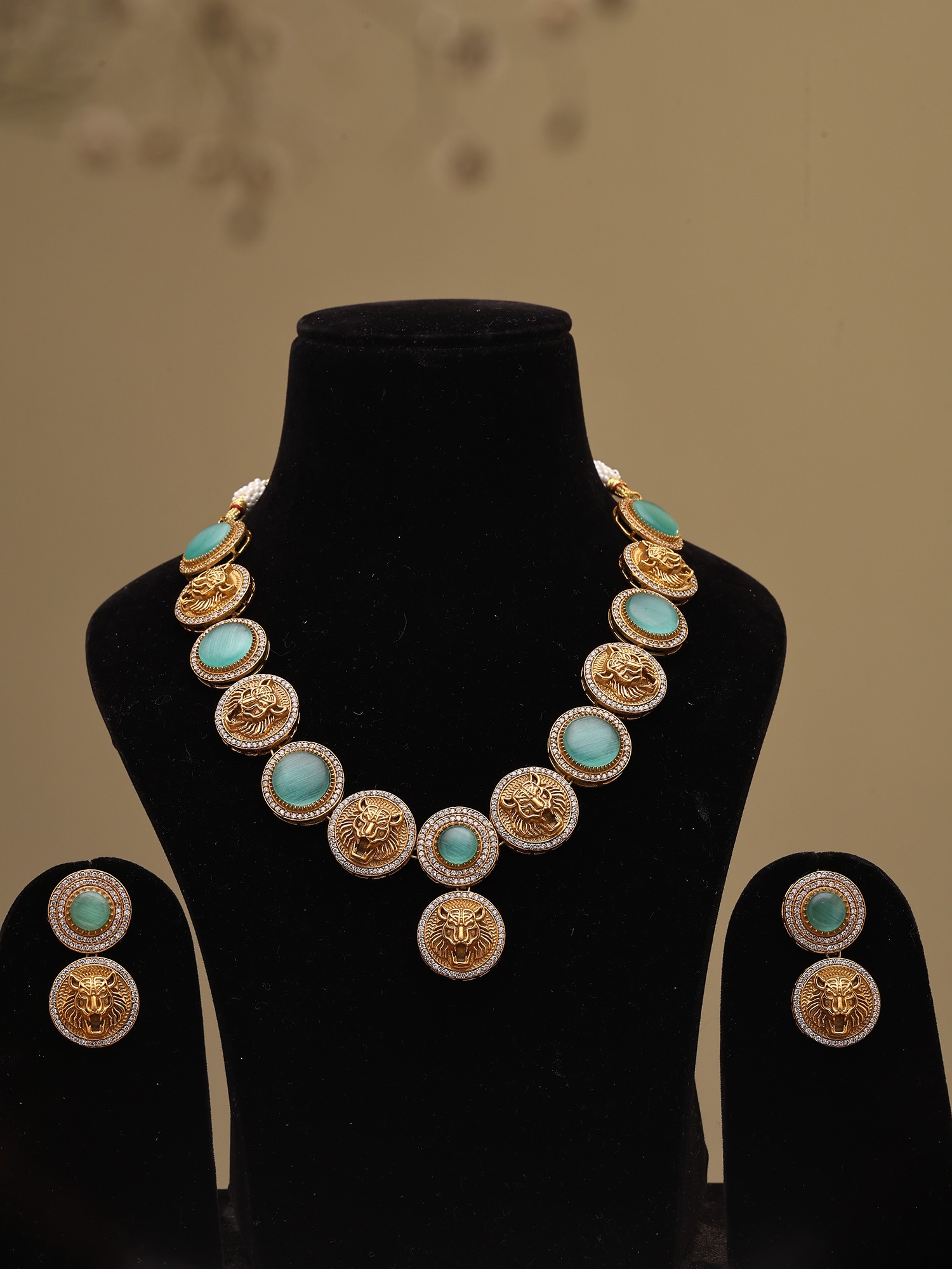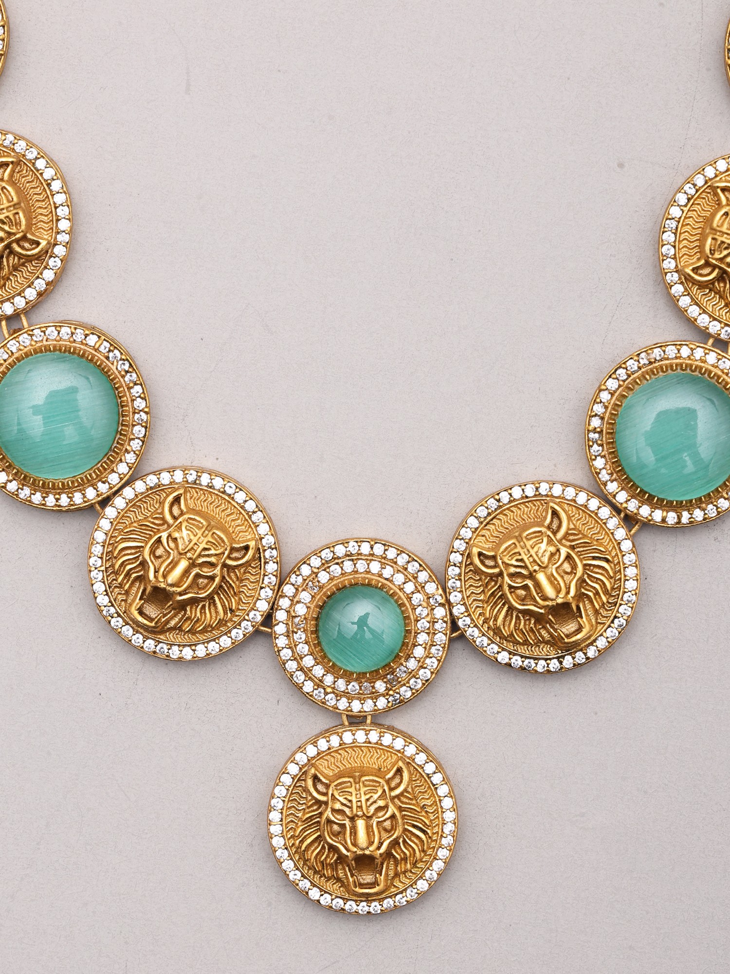 Unleash your inner queen with this exquisite V-shaped statement necklace and earring set, a masterpiece designed to command attention and celebrate your unique style. Crafted with precision from lustrous brass, this ensemble features a captivating arrangement of bold lion motifs, each intricately detailed to exude power and majesty. The rich gold tone of the brass serves as a perfect backdrop for the striking aquamarine-colored stones, which are round and nestled within each lion's regal embrace. These vibrant gems, shimmering with an inner light, add a touch of enchanting color and sophistication to the design, creating a stunning contrast with the warm metallic hues.