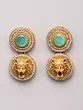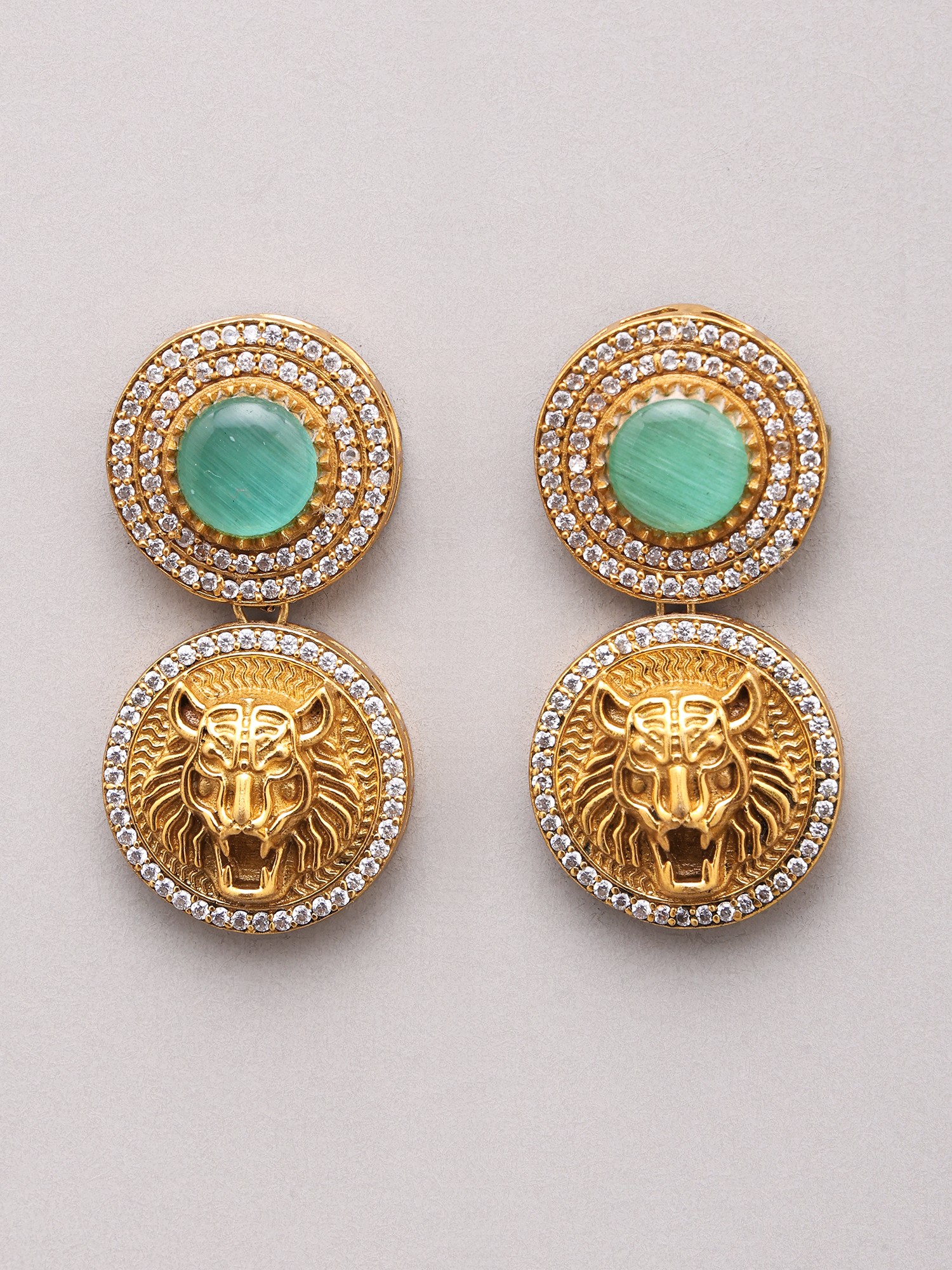 This set is perfectly completed by a pair of matching earrings that echo the grandeur of the necklace. Each earring features a smaller, equally detailed lion motif, crowned with a vibrant aquamarine-colored stone. These earrings are designed to be the perfect accompaniment, adding a touch of coordinated elegance without overpowering the statement of the necklace. They are substantial enough to make an impression yet designed for comfortable, all-day wear, making them a versatile addition to any jewelry collection.