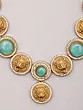 The necklace itself is a work of art, meticulously constructed to form a flattering V-shape that accentuates the décolletage. Each link is thoughtfully designed, alternating between the striking lion medallions and the luminous colored stones. The lions are rendered with exceptional detail, their fierce yet noble expressions frozen in time, surrounded by delicate, textured detailing that speaks of masterful craftsmanship. The gemstones are securely set, their smooth surfaces catching the light with every movement. The necklace is completed with a classic white pearl beaded chain at the back, offering an adjustable fit for comfortable wear and a touch of classic charm.