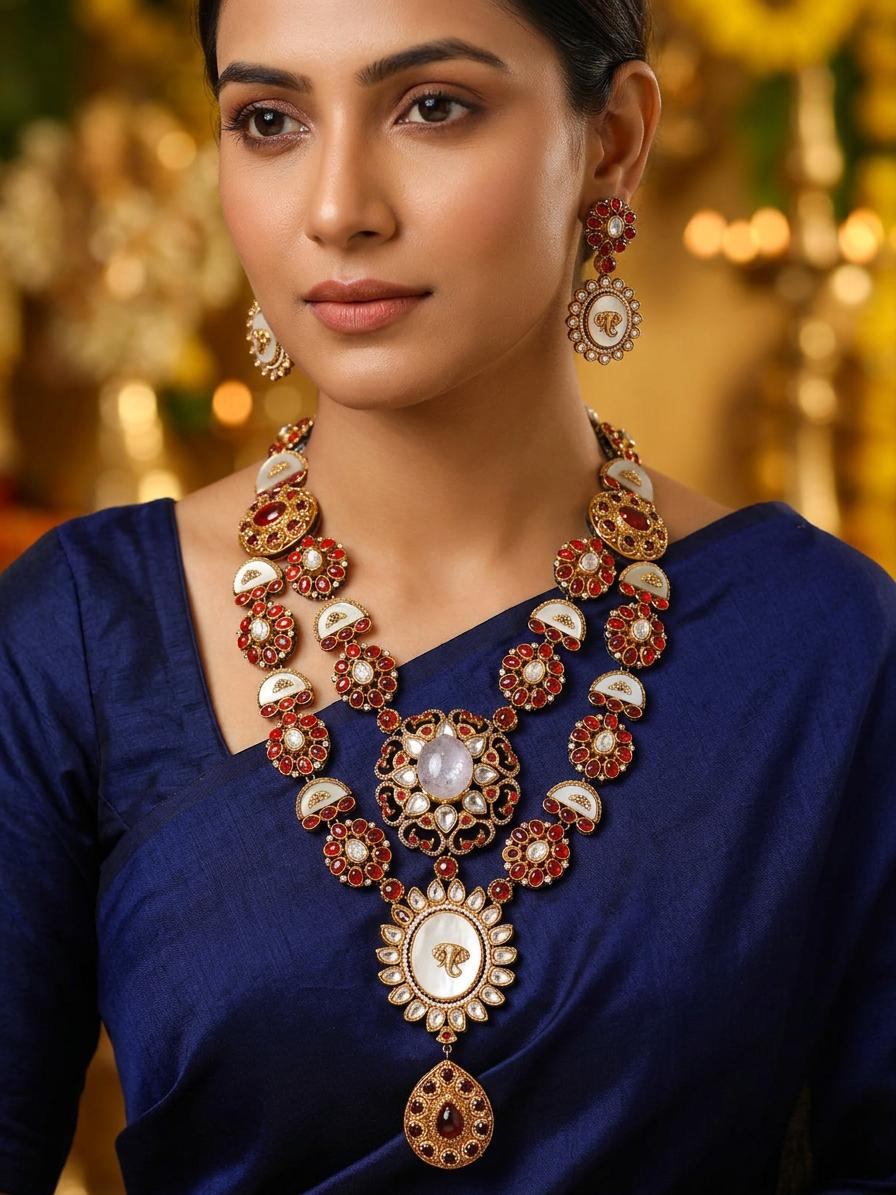 Indulge in the opulence of the Victoria Polish Traditional Double Layer Long Necklace Set, a breathtaking piece designed to capture hearts and elevate any ensemble. This exquisite necklace, crafted with meticulous detail, showcases the rich heritage of traditional Indian jewelry making. The interplay of deep red gemstones and gleaming gold creates a mesmerizing visual spectacle that is both classic and contemporary. The double-layered design adds depth and movement, ensuring this necklace will be the statement piece of your collection. Each element, from the intricately carved motifs to the carefully selected stones, has been thoughtfully placed to create a harmonious and captivating design.