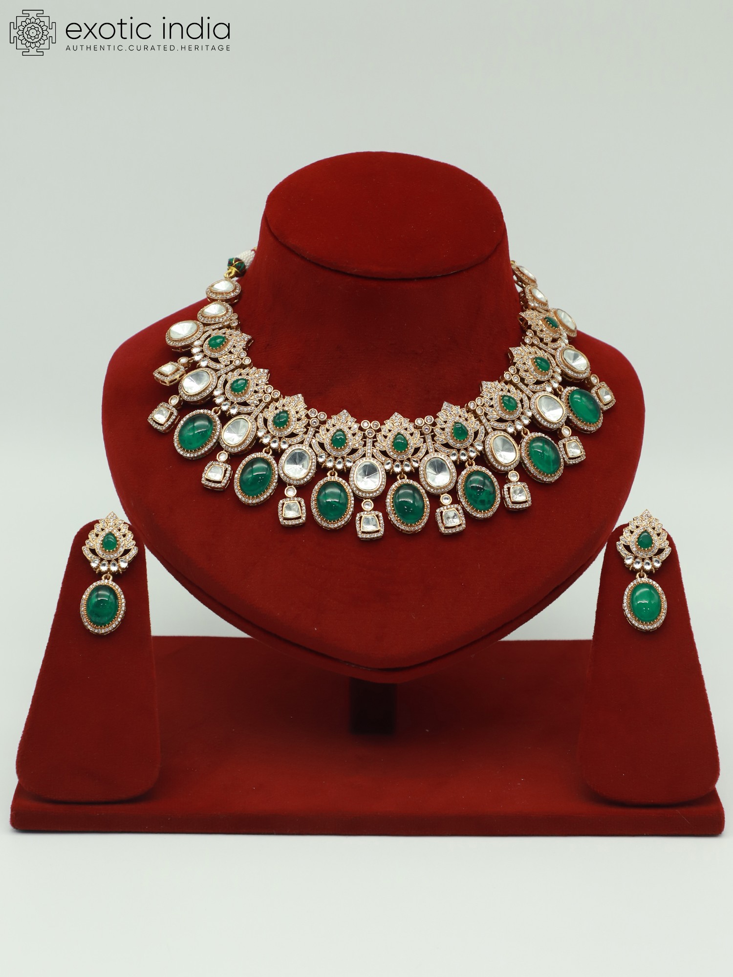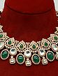 Kundan Stone Necklace Set With Brass Carving, Pearls, Earrings And Mangtika