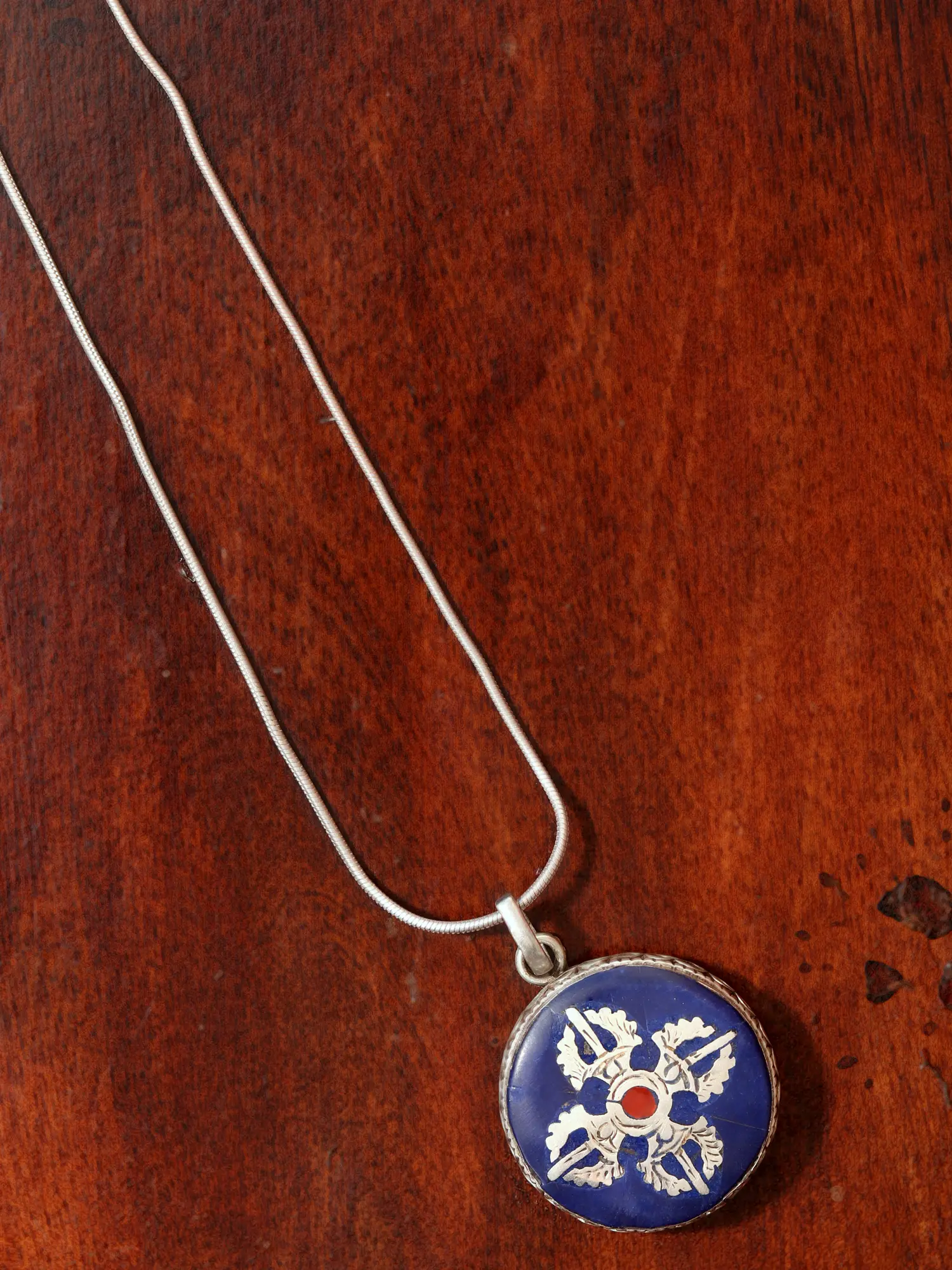 This Vishva Vajra Inlay Pendant is a symbolic representation of balance and protection. The pendant features the Vishva Vajra, also known as the double dorje, which is a spiritual symbol in Vajrayana Buddhism that represents the principle of absolute stability.