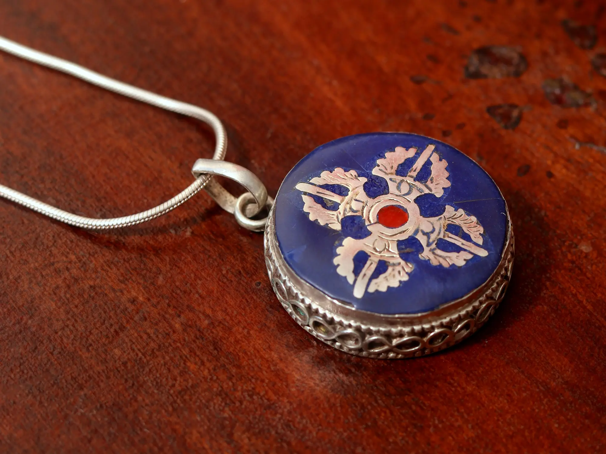 The central motif is inlaid with precision, showcasing a white metal that contrasts beautifully against the blue, with a central red dot that draws the eye, symbolizing the unity of the universe. The silver bezel setting encircles the intricate inlay work, enhancing its visual impact while adding to the pendant's overall durability.