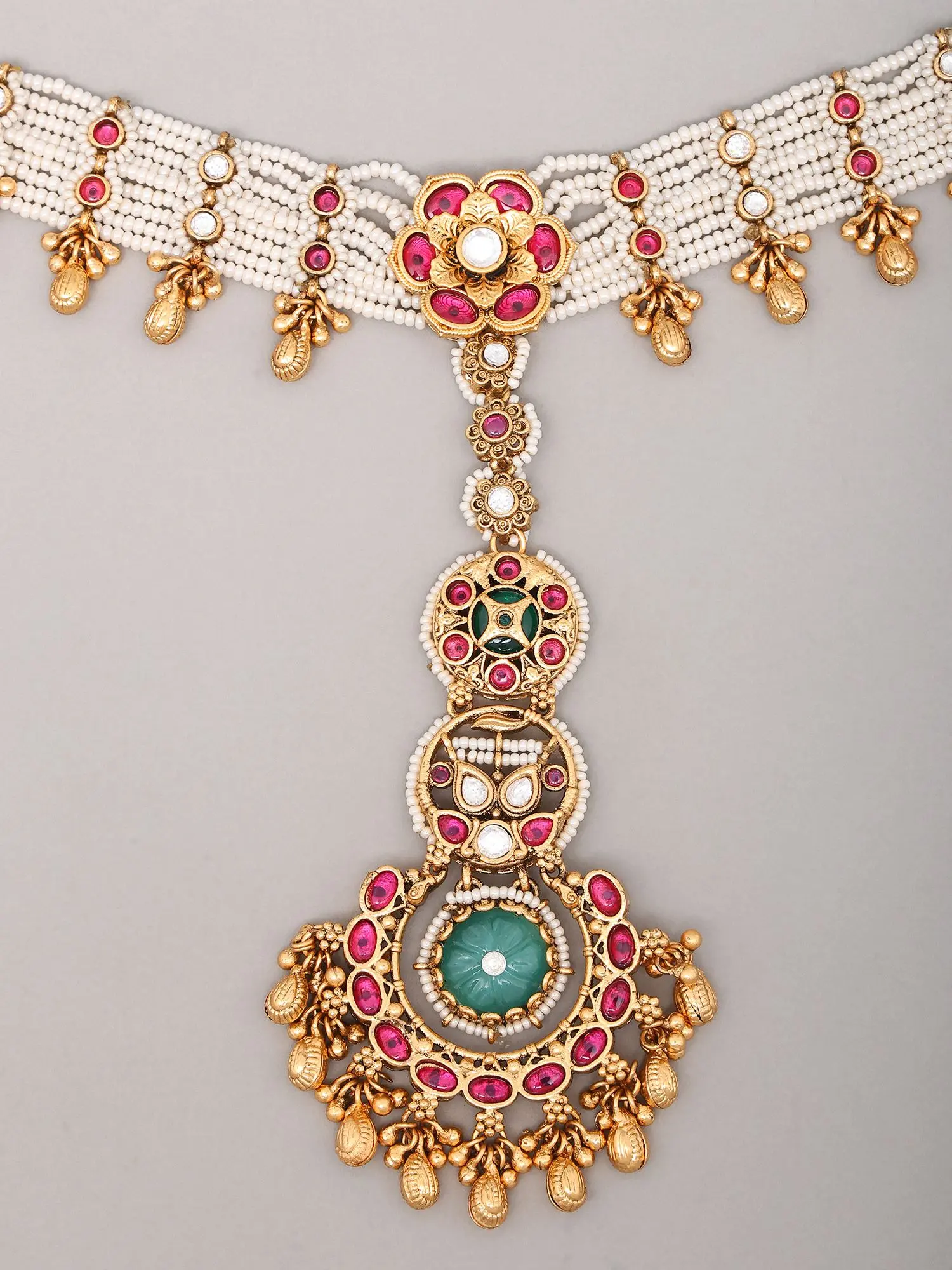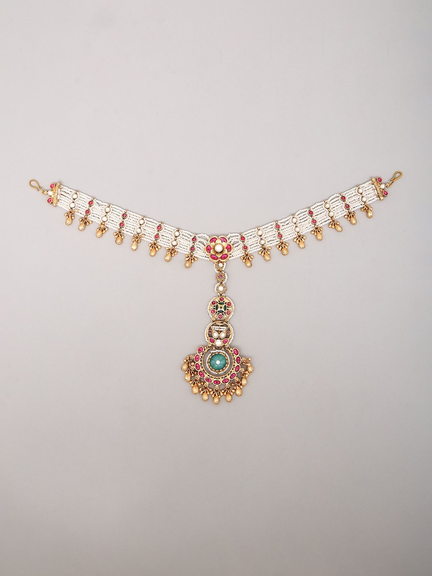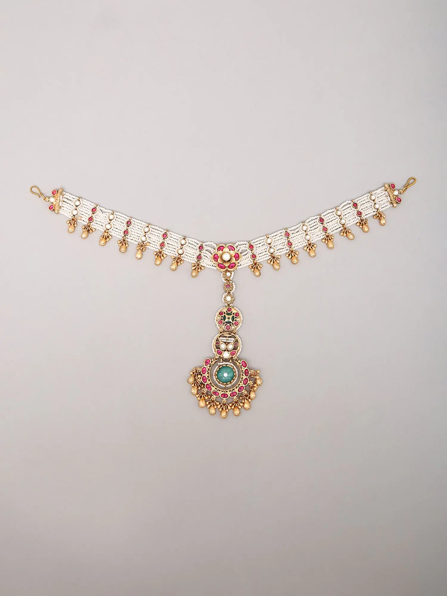 White Beaded Multi-Strand Kundan Matha Patti With Ghungroo