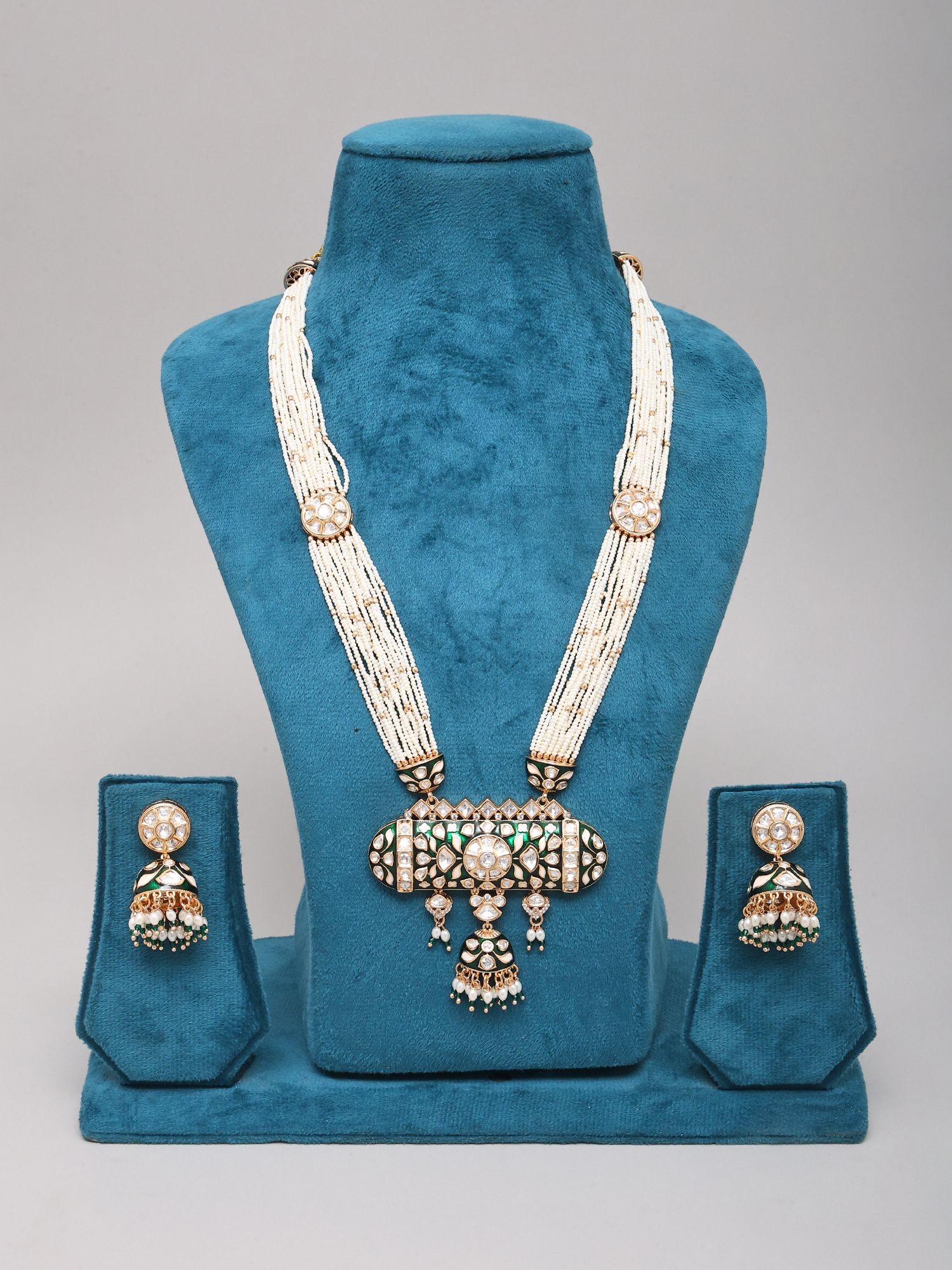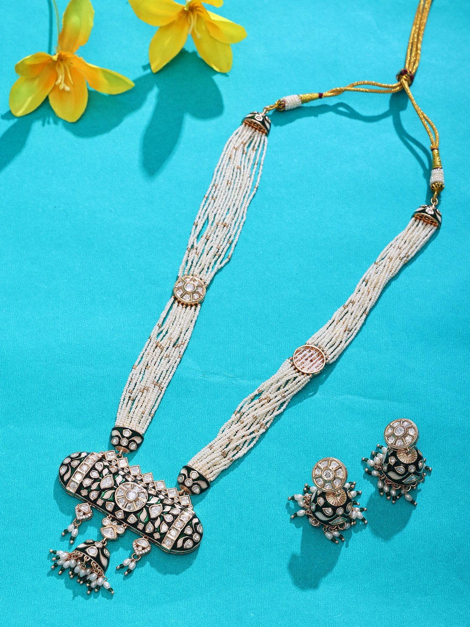 White Beaded Multi-Strand Kundan Necklace Set with Meenakari Detailing