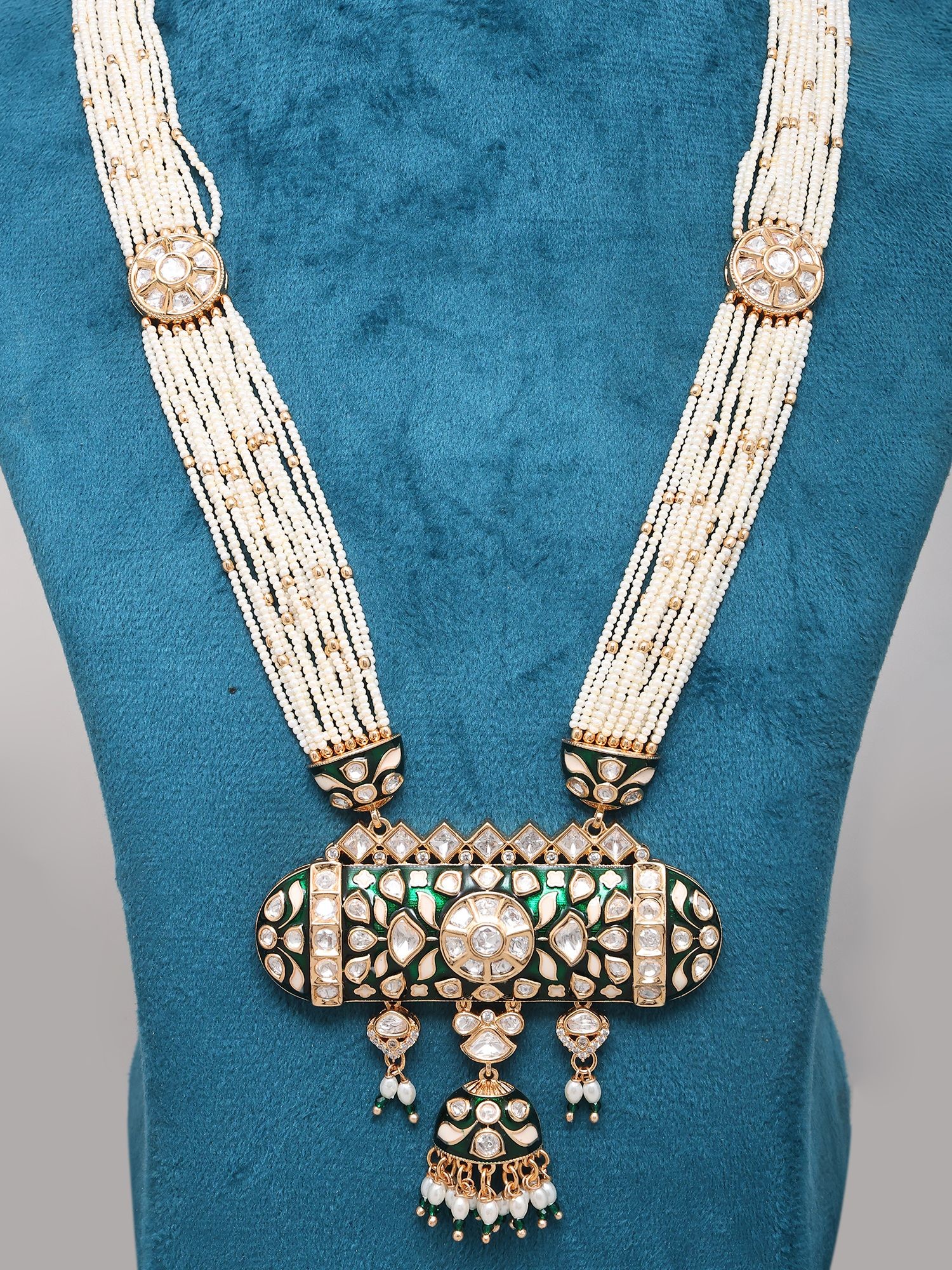 The central pendant showcases exquisite craftsmanship and gemstone embellishments.