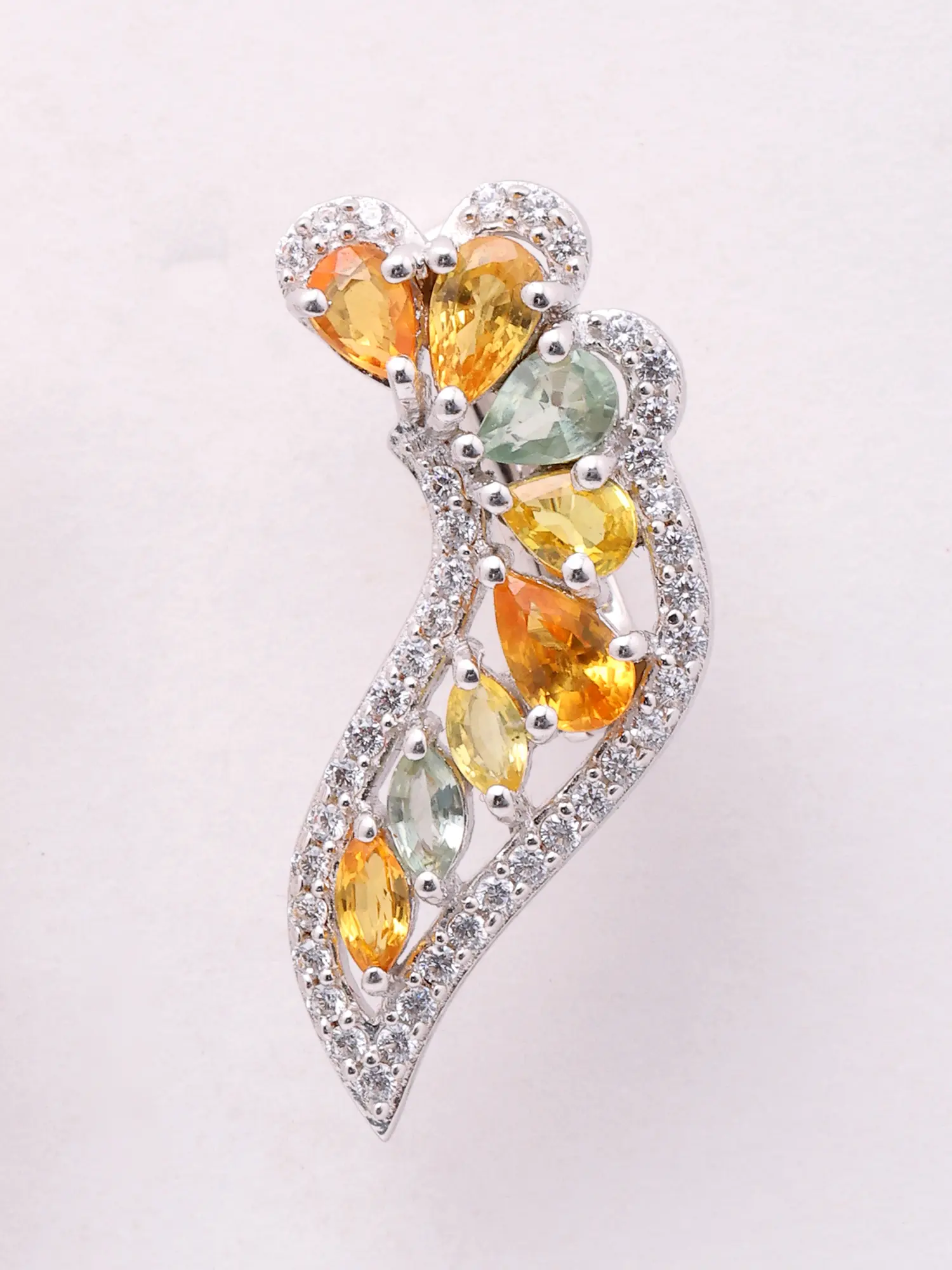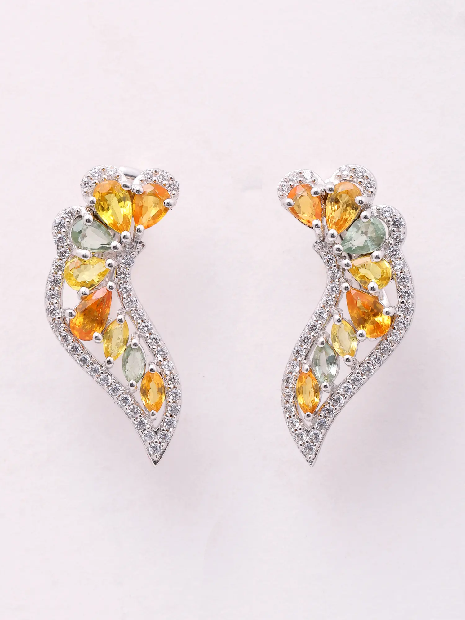 The true magic of these earrings lies in their captivating gemstones. A medley of faceted tourmaline stones, hand-selected for their rich and varied colors, are artfully arranged along the curve of each wing. Shades of warm amber and sunny yellow mingle with cool, serene greens, creating a mesmerizing color palette that evokes the vibrant hues of a summer sunset or a lush, natural landscape. The careful faceting of each tourmaline stone ensures that they catch the light beautifully, creating a dazzling display of sparkle and depth with every movement.