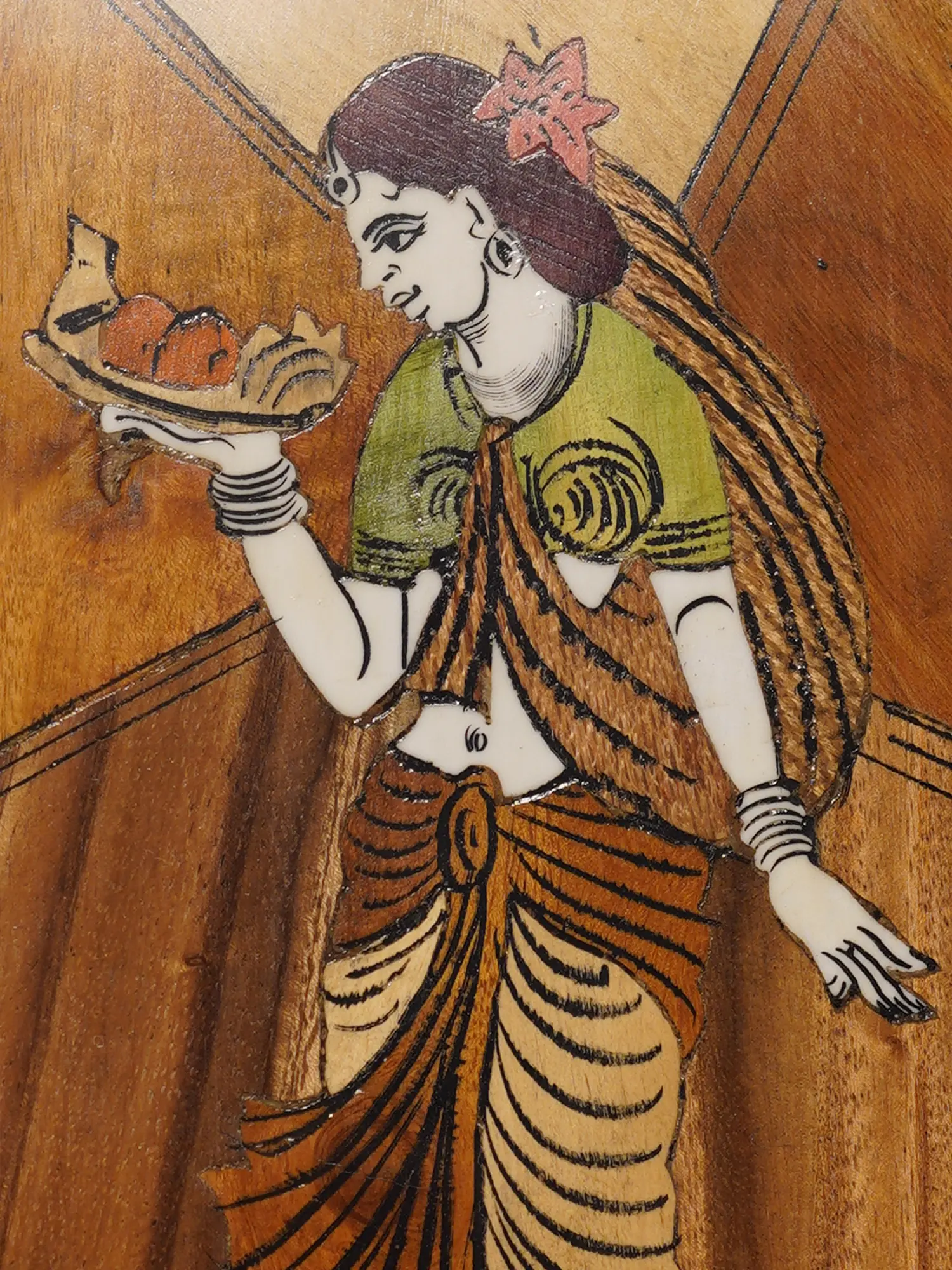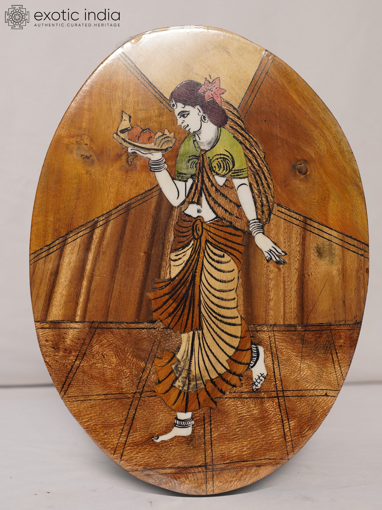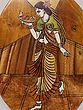 36" Lady Worshipping Ganesha | Natural Color On 3D Wood Painting With Inlay Work