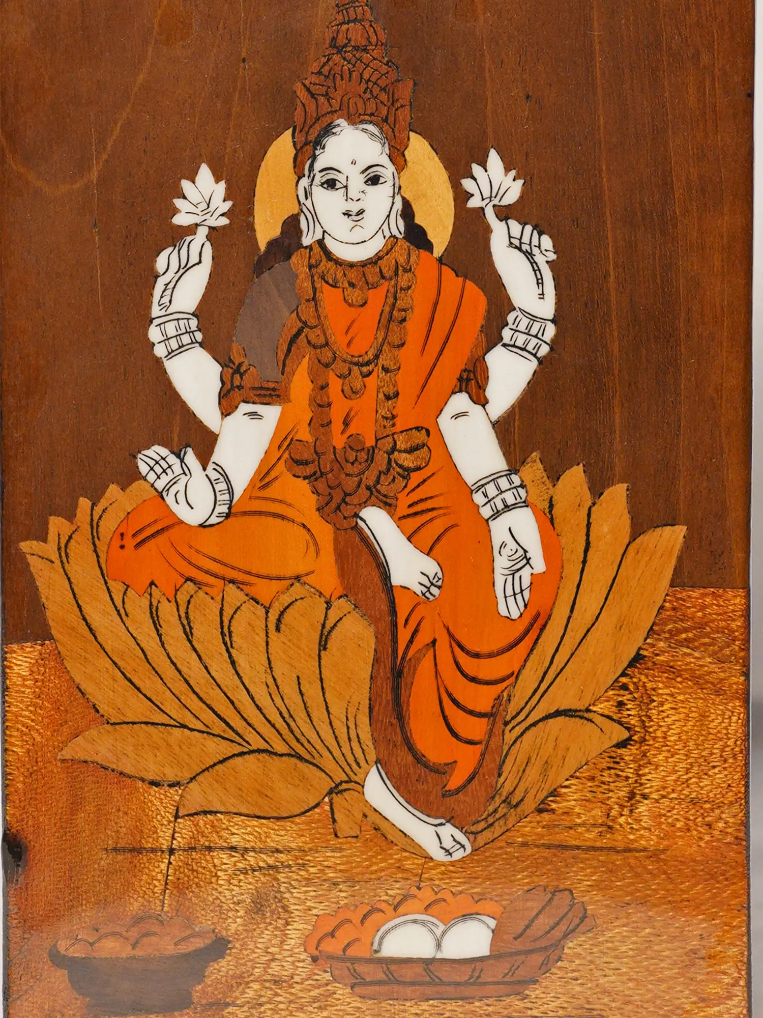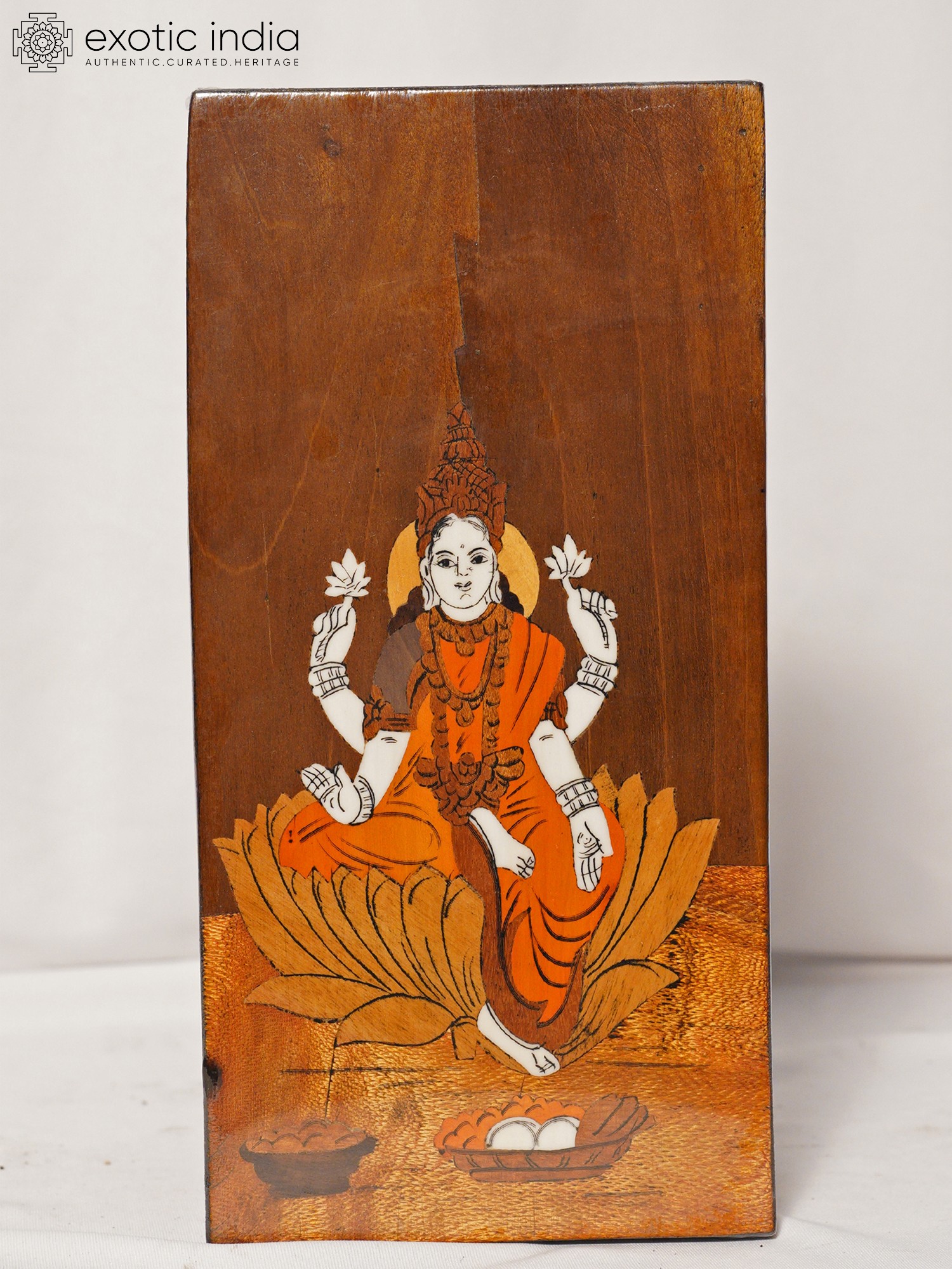 18" Goddess Lakshmi | Wood Panel | Natural Color On Wood Inlay Work