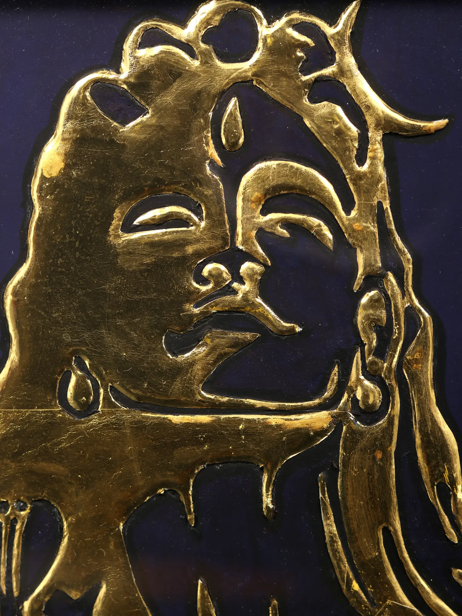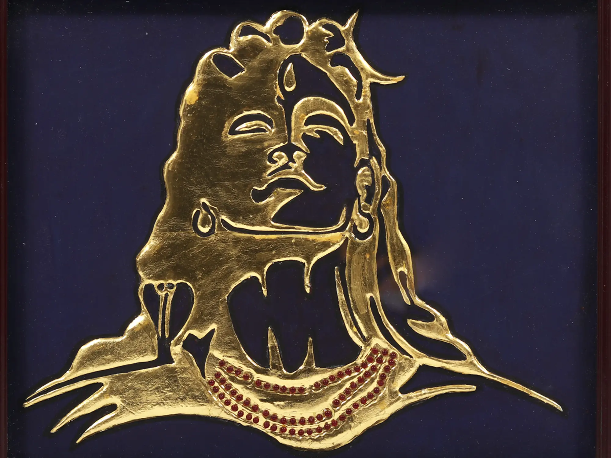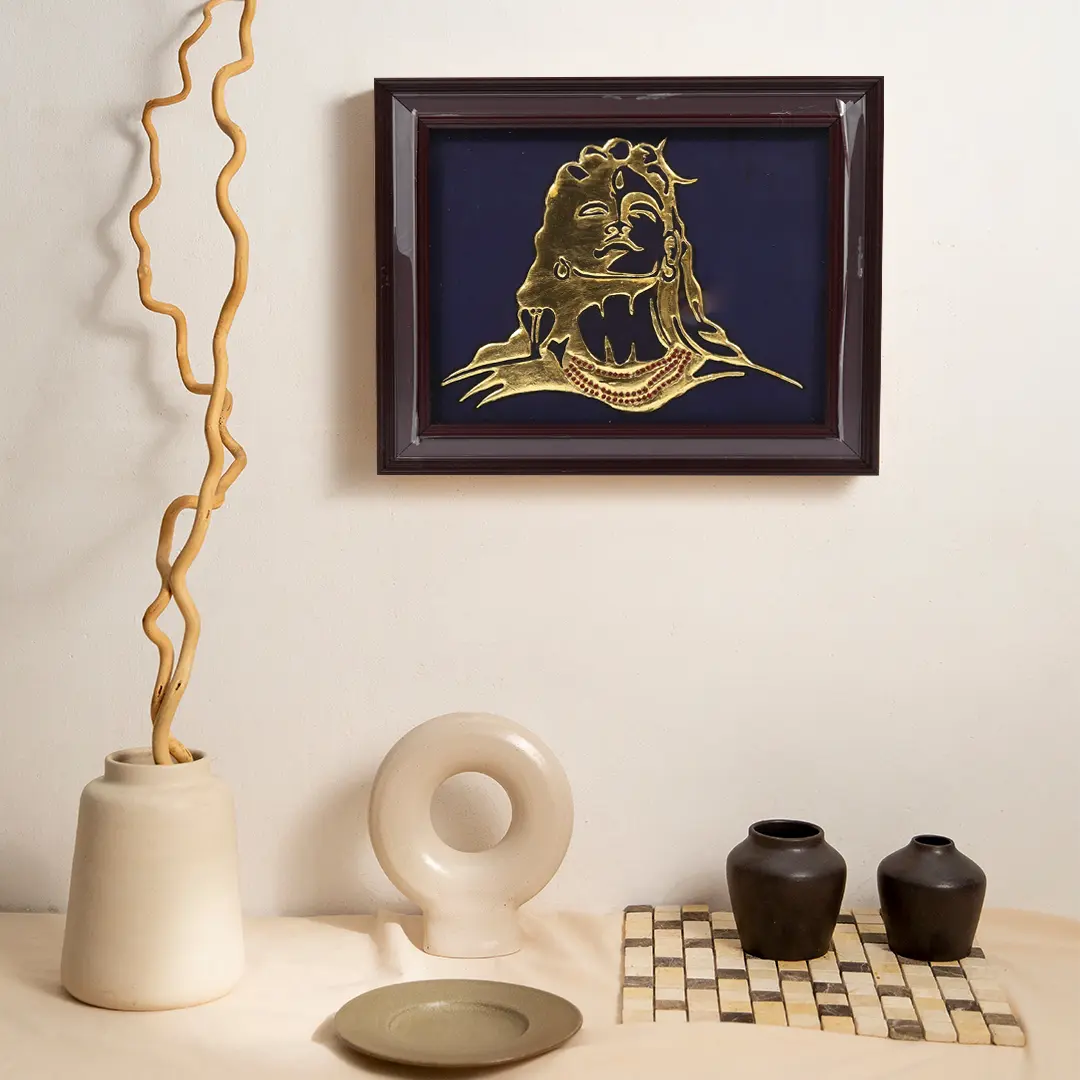 Framed within the embrace of an elegant frame, this Tanjore painting unfolds the transcendent visage of Adiyogi Shiva, the first yogi and the source of all yogic knowledge. With matted locks and an enigmatic third eye, the Adiyogi radiates the serenity and depth of ever-standing wisdom. The artwork, with its beautiful gold studding serves as a reminder of the boundless knowledge and inner transformation that yoga offers.