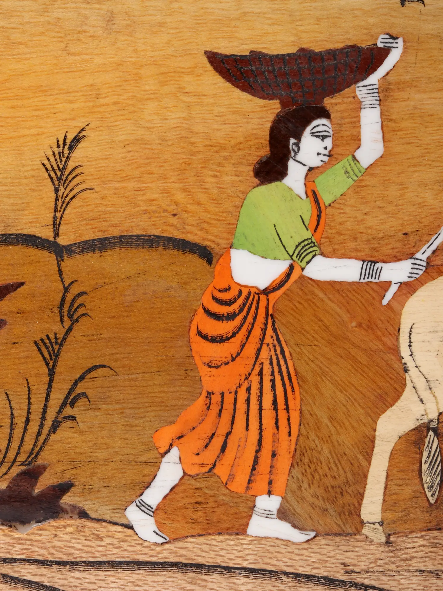 The striking visual narrative unfolds across a generous 15-inch width, its 10-inch height perfectly proportioned. A woman, adorned in traditional attire, carries a basket atop her head while guiding a gentle cow and a loyal dog. The natural wood itself forms the foundation, its grain and tone contributing to the earthy palette. Delicate inlay work defines the figures, the surrounding landscape, and even the birds gracefully depicted in flight, adding depth and character to the scene. The rich wooden frame further enhances its presence.