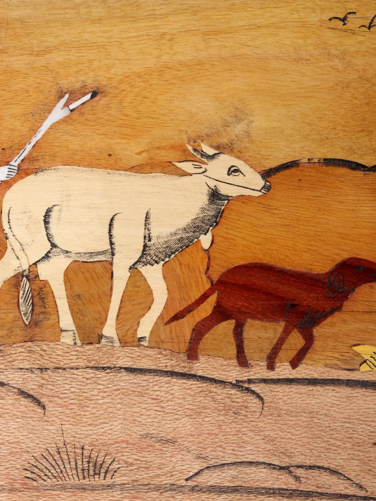 The inlay work adds intricate details, enhancing the rustic charm of the pastoral setting. This artwork not only celebrates the pastoral lifestyle but also evokes a longing for the serene and idyllic qualities often associated with the simplicity of rural existence.