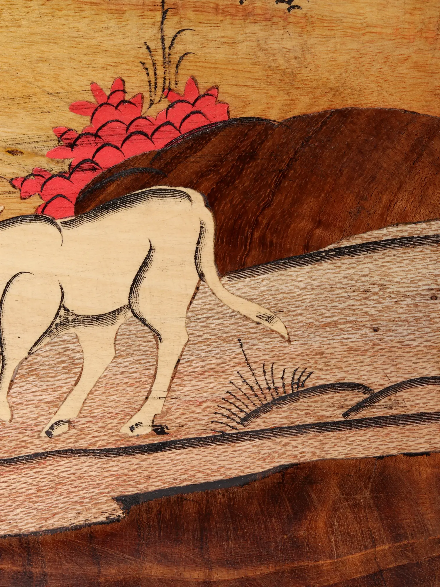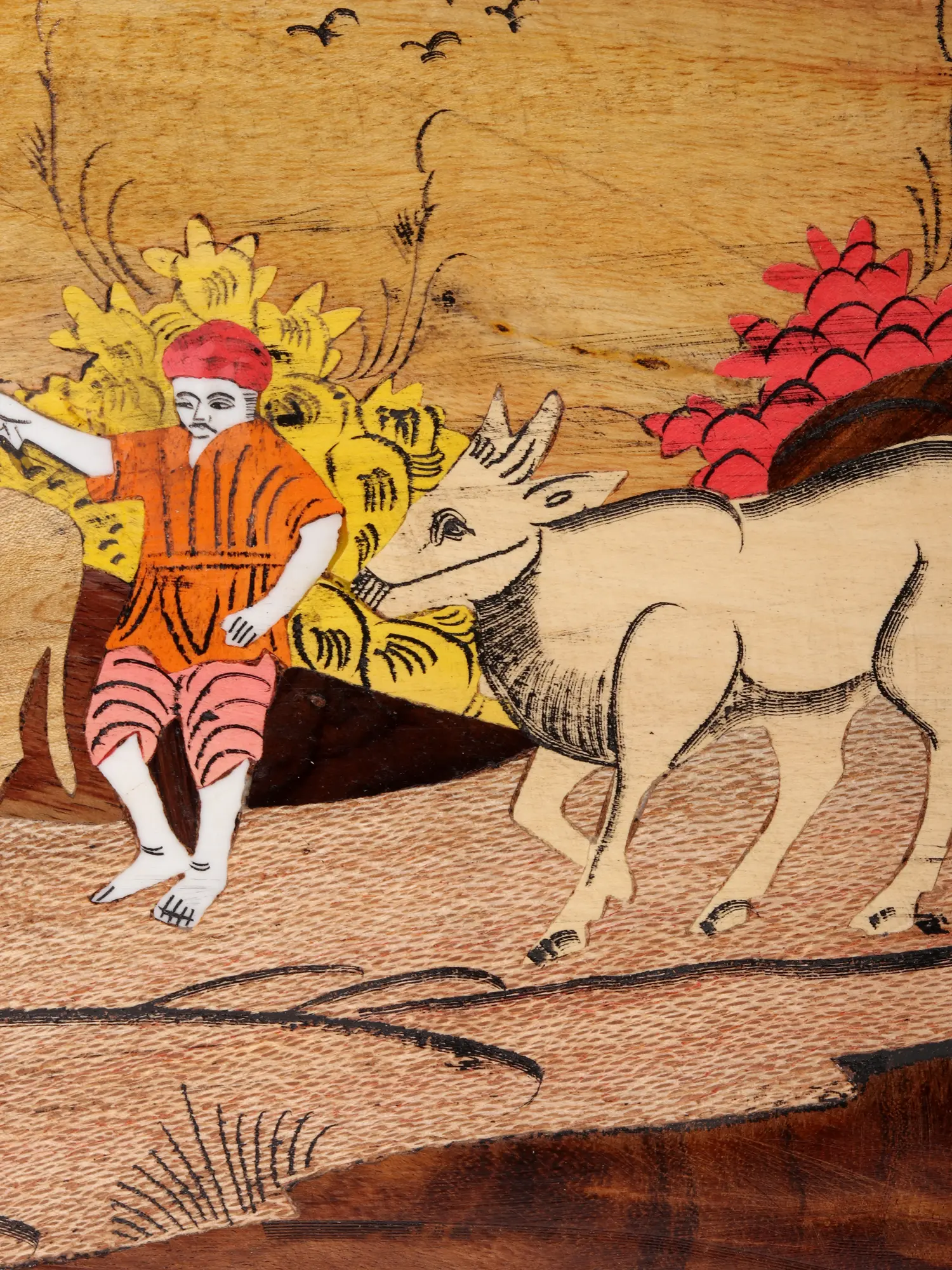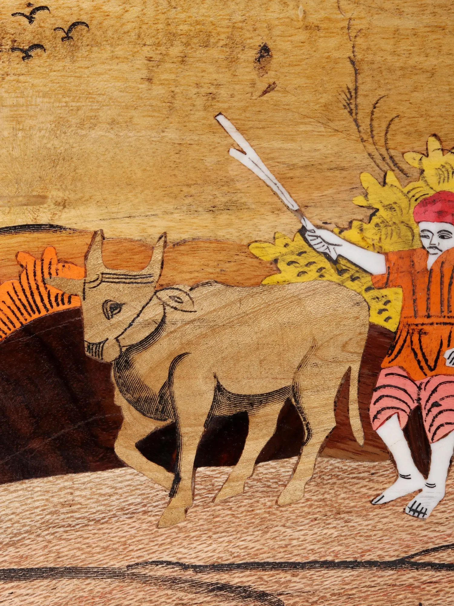 The composition unfolds across a natural wood canvas, measuring fifteen inches in width and ten inches in height, with a subtle thickness of half an inch. You'll appreciate the vibrant yet natural palette used to depict the farmer in his traditional attire and the sturdy form of his cattle. The scene is further enhanced by delicately etched details of foliage and a distant, undulating landscape, all framed by a rich, dark wood border that provides a striking contrast. The interplay of light and shadow, achieved through the subtle variations in the inlaid wood, brings the entire scene to life.