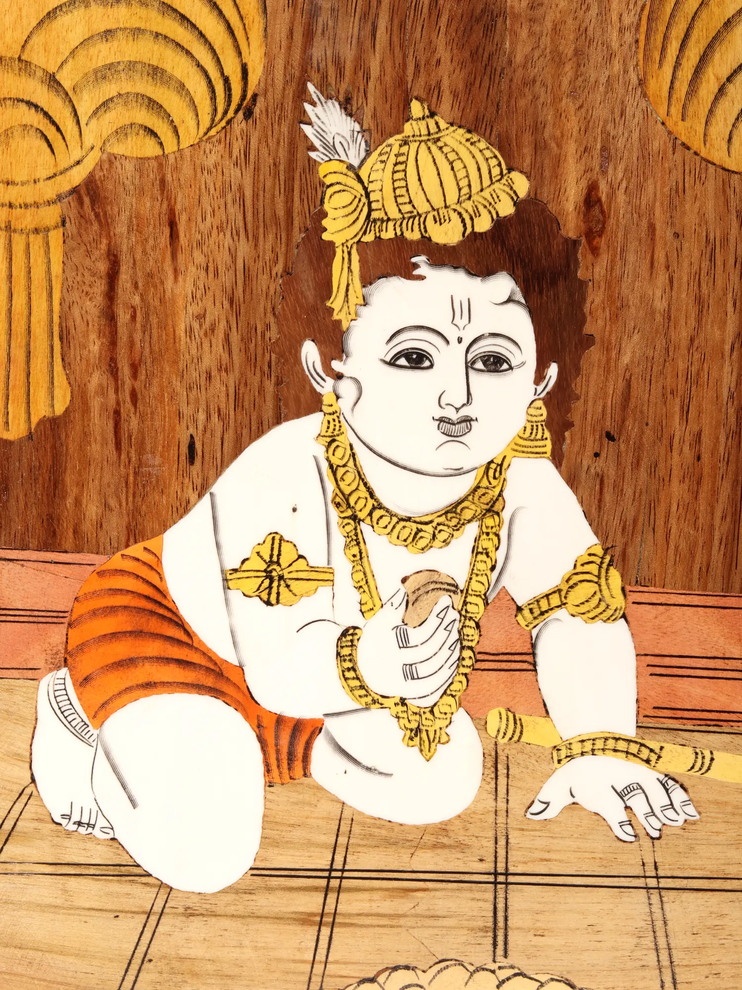 This heartwarming artwork on wood, rendered in natural colours, portrays Krishna in his adorable childhood form as Bal Gopal. The natural tones exude a sense of warmth and innocence. This piece reflects the philosophy of Krishna's Leela, the divine play of the universe embodied in his childhood stories, and serves as a reminder of the joy and simplicity found in life's beginnings.