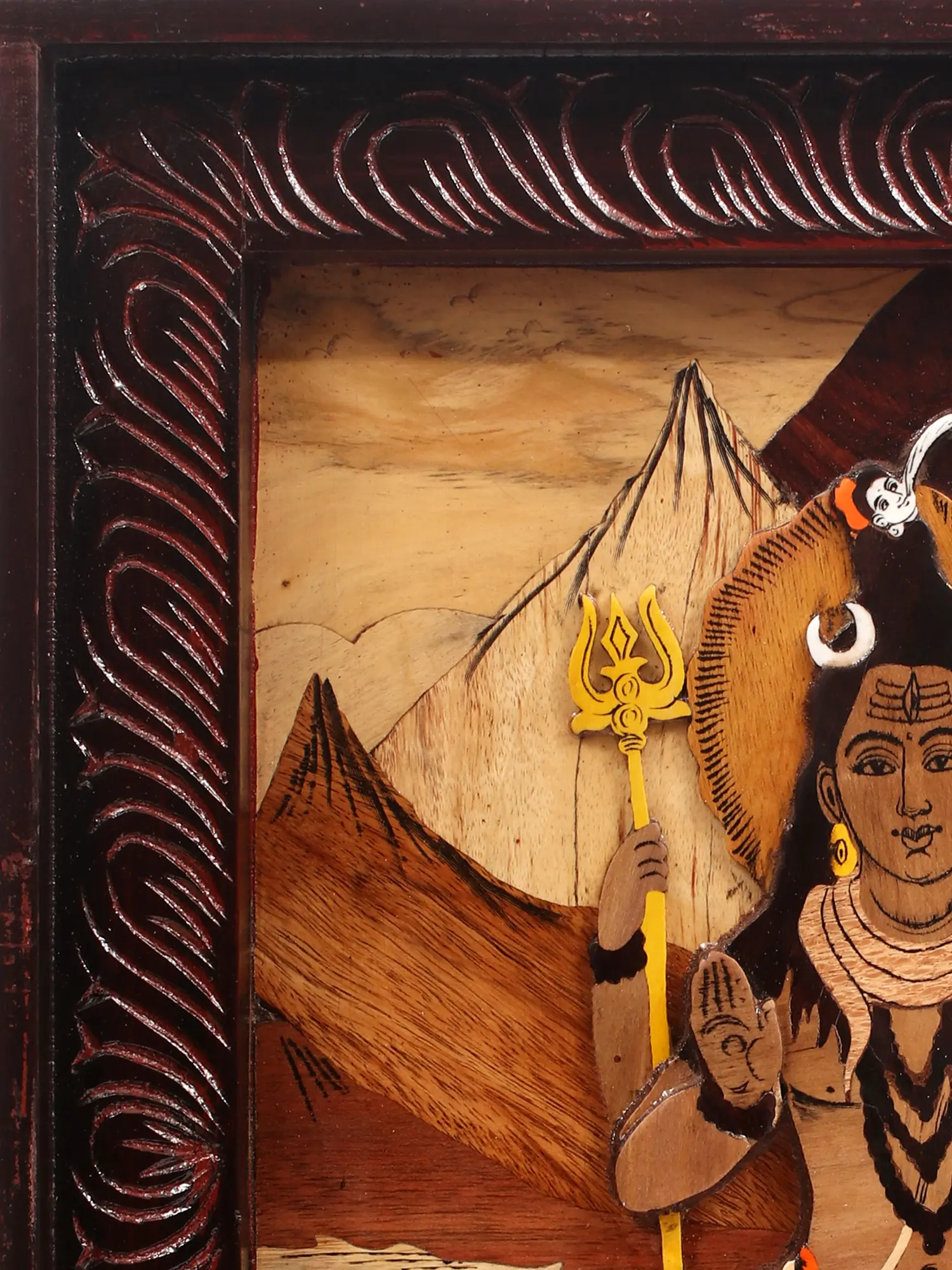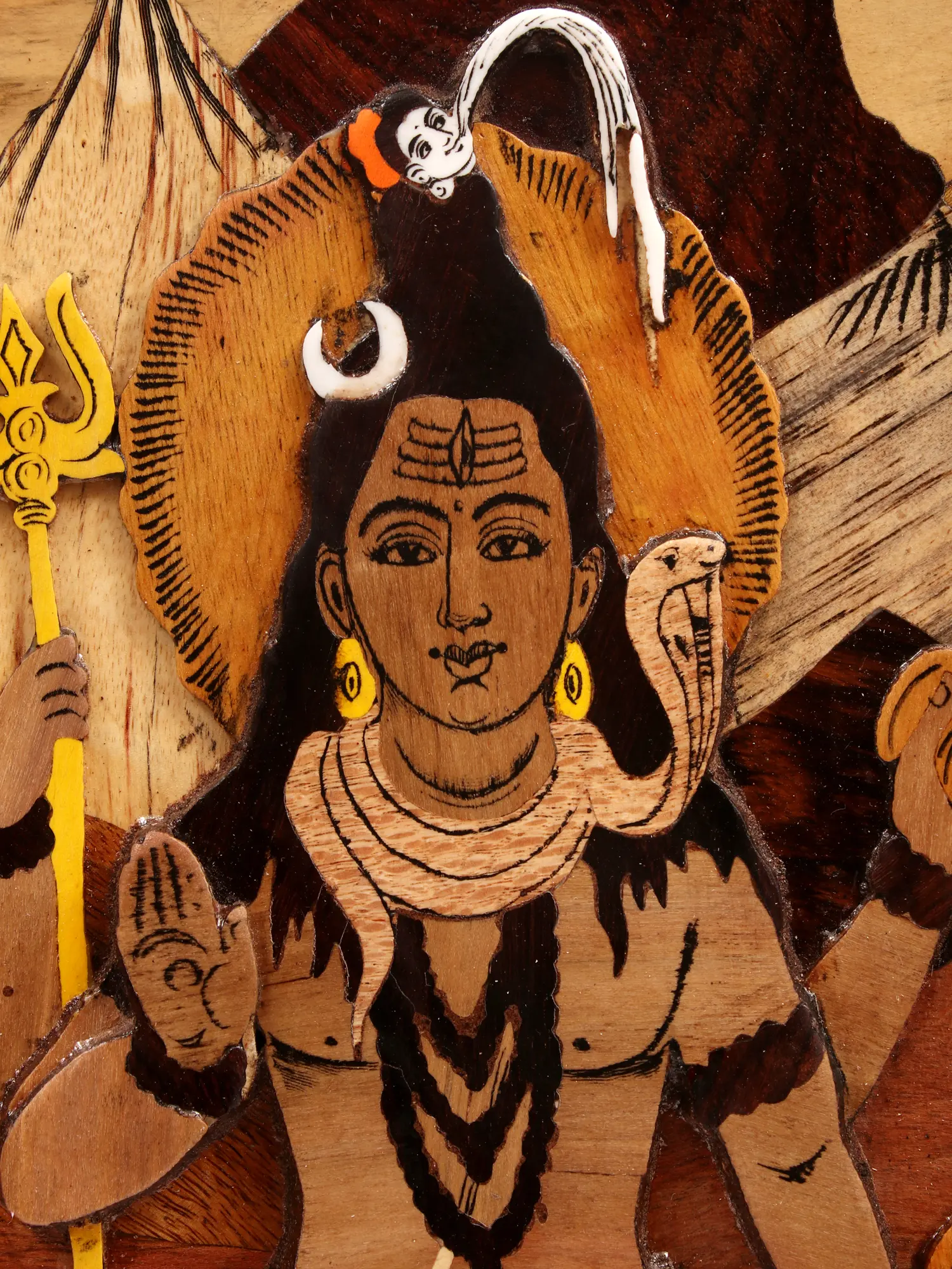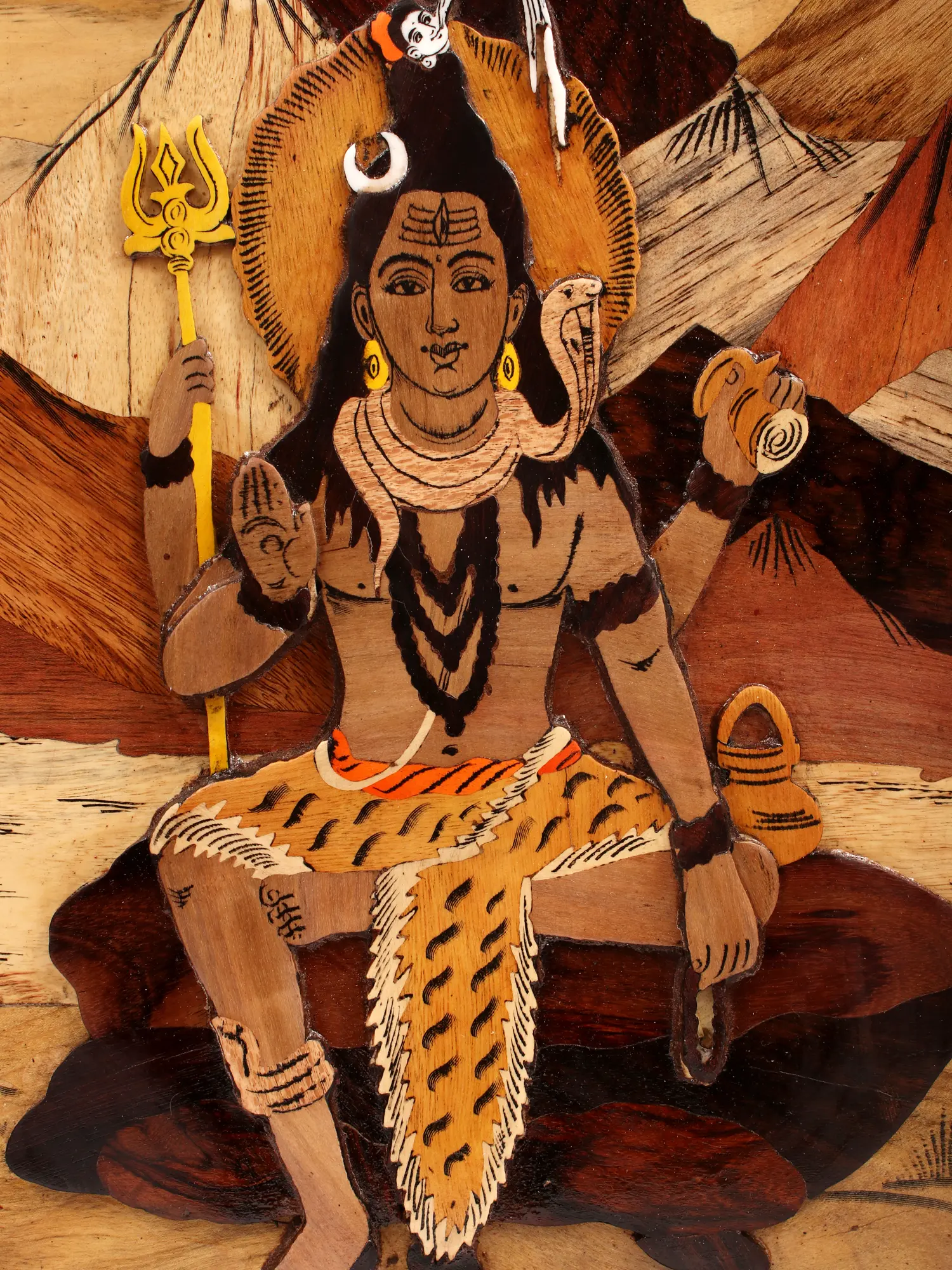 The image of Blessing Lord Shiva not only embodies divinity but also captures the spiritual essence of human life. It symbolizes Lord Shivas' patronage over the cycle of creation, preservation, and destruction, encouraging devotion and surrender to the supreme lord. This 3D Panel in Rosewood with Inlay Work enhances this representation with meticulous detailing. The use of natural colors in inlay work brings out the beauty of the image, particularly highlighting Lord Shiva's tiger cloth and the surrounding landscape.