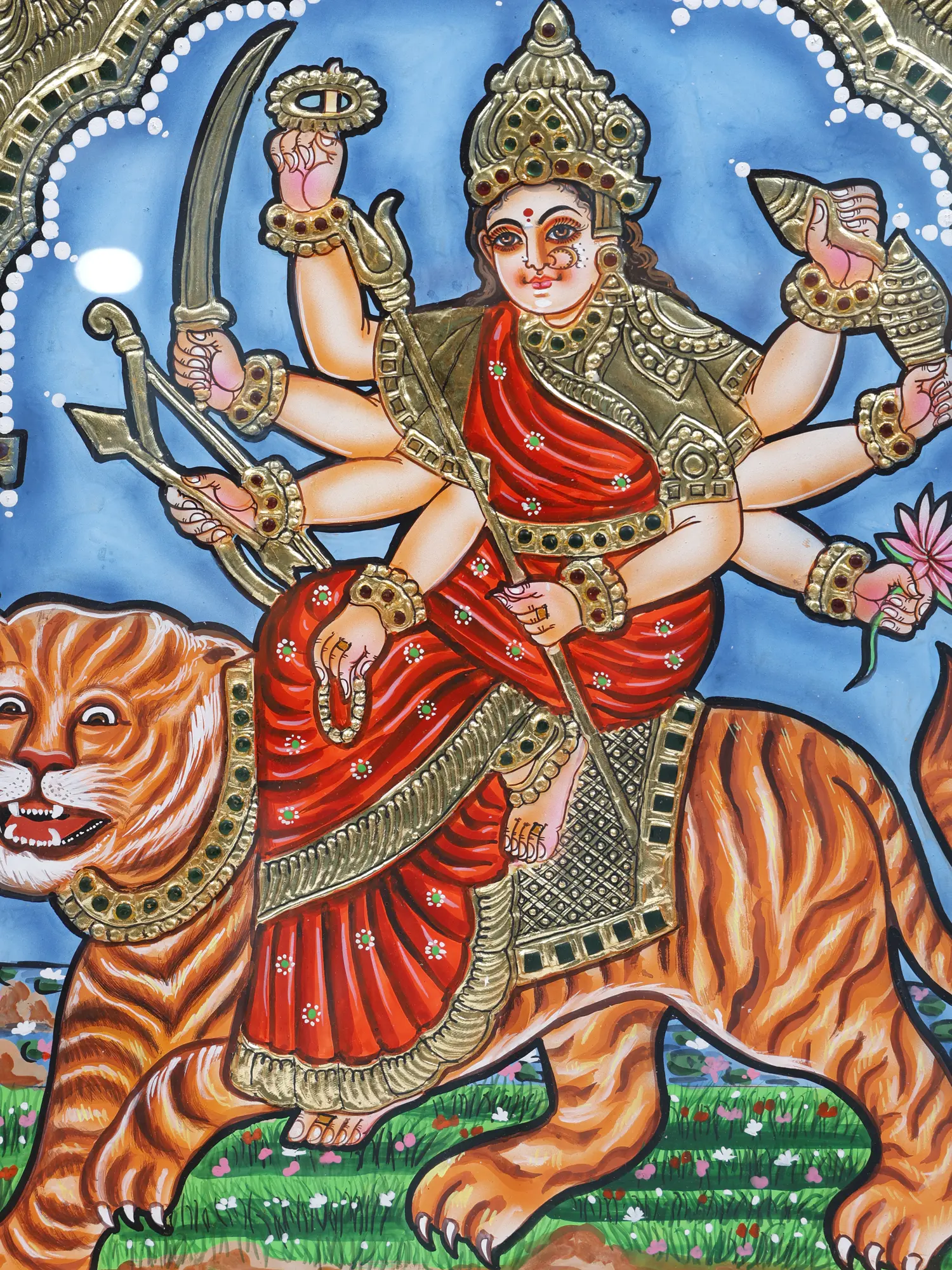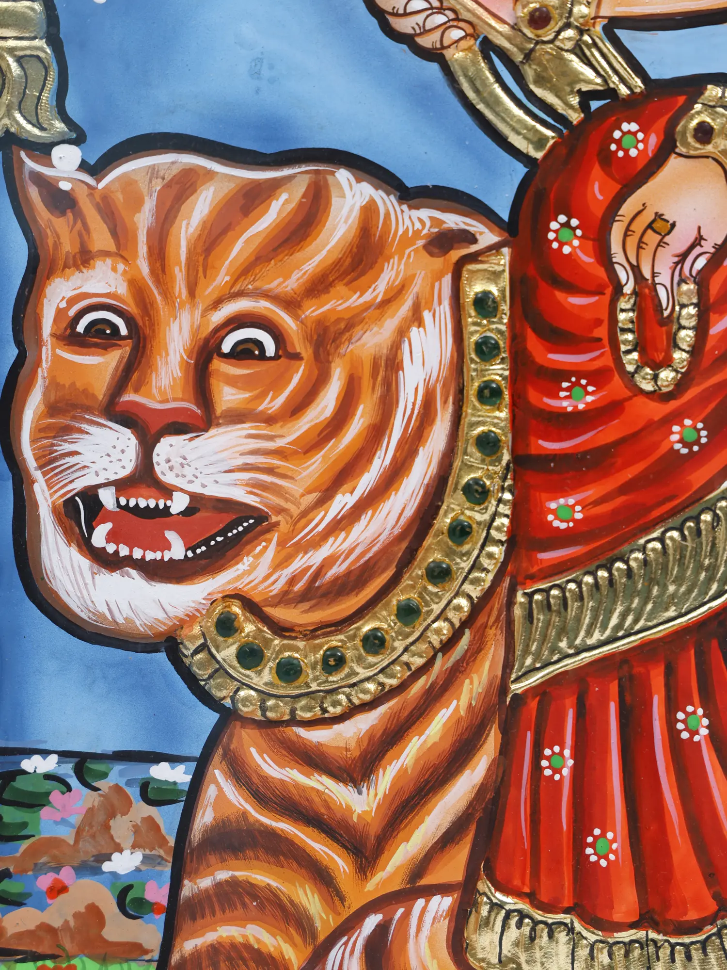 Gold work embellishes the painting, complemented by the lacquered wooden frame that prolongs the age of the Tanjore, making this a perfect portable temple of Sherawali Maa Durga.