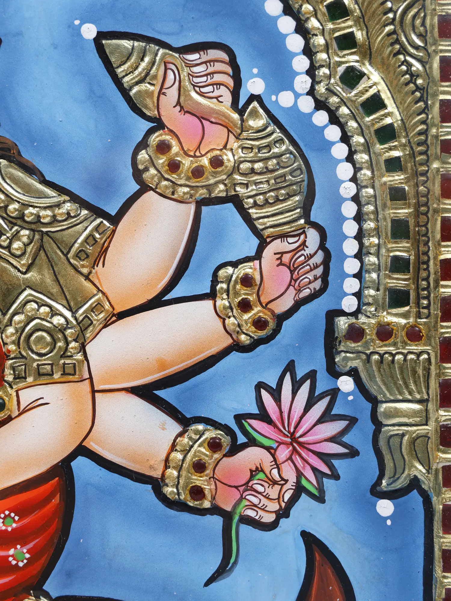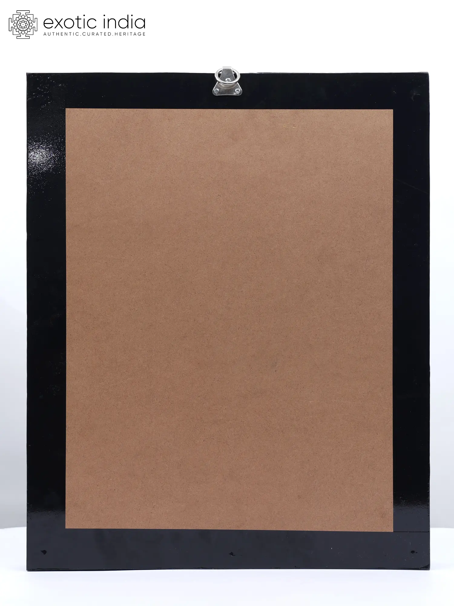 Seated on her roaring lion, adorned regally, Maa Durga in this Tanjore painting smiles benevolently, blessing the devotee with her presence.