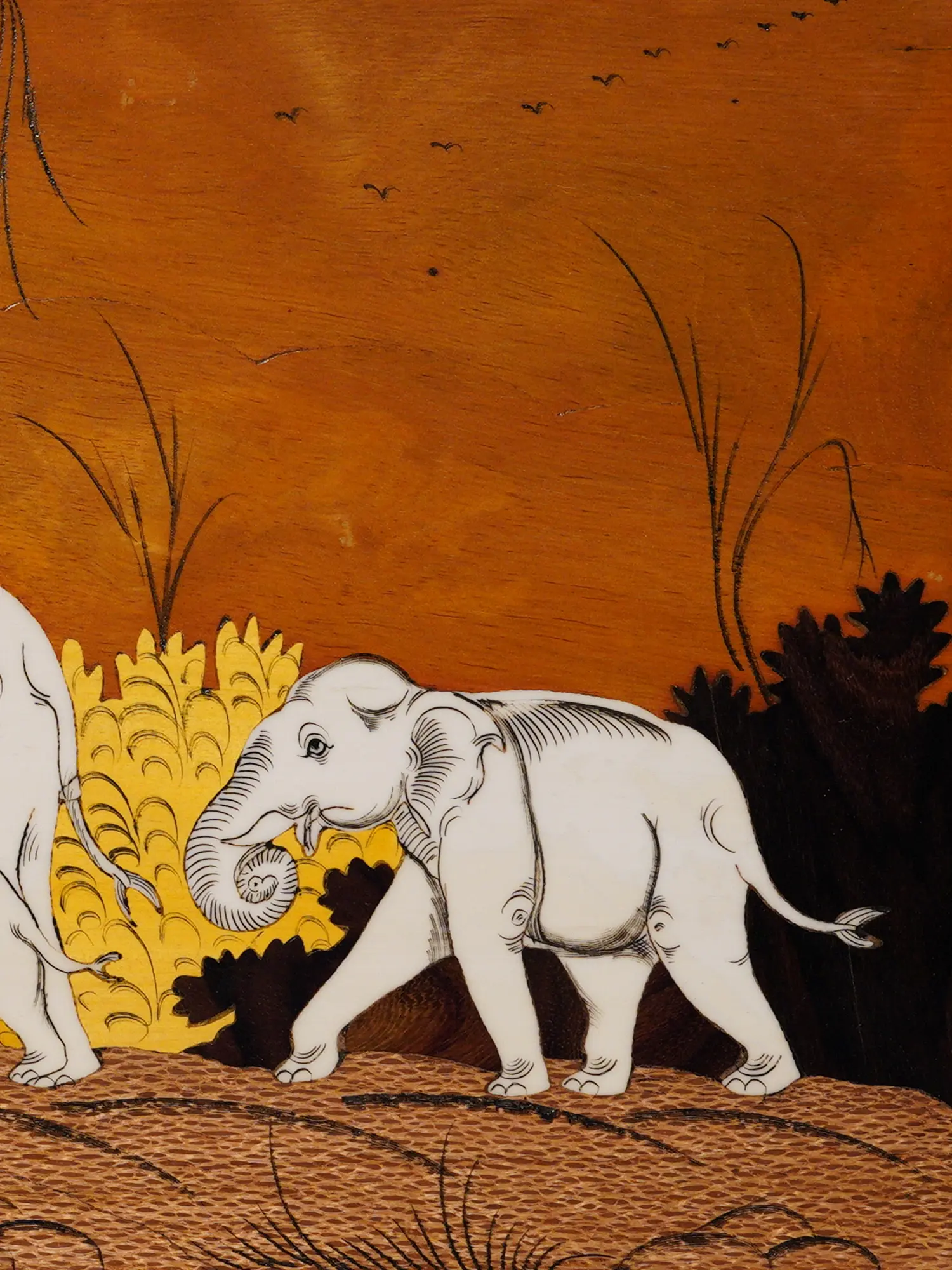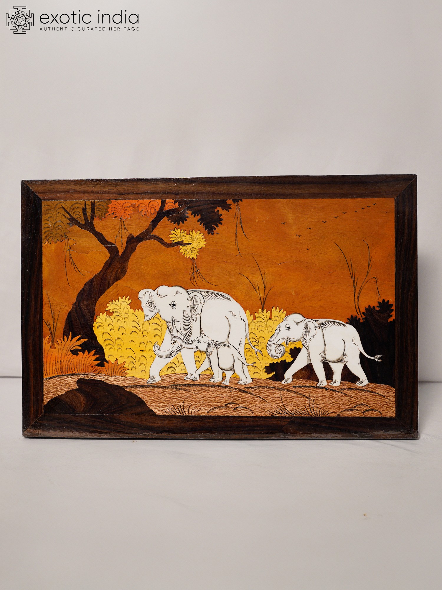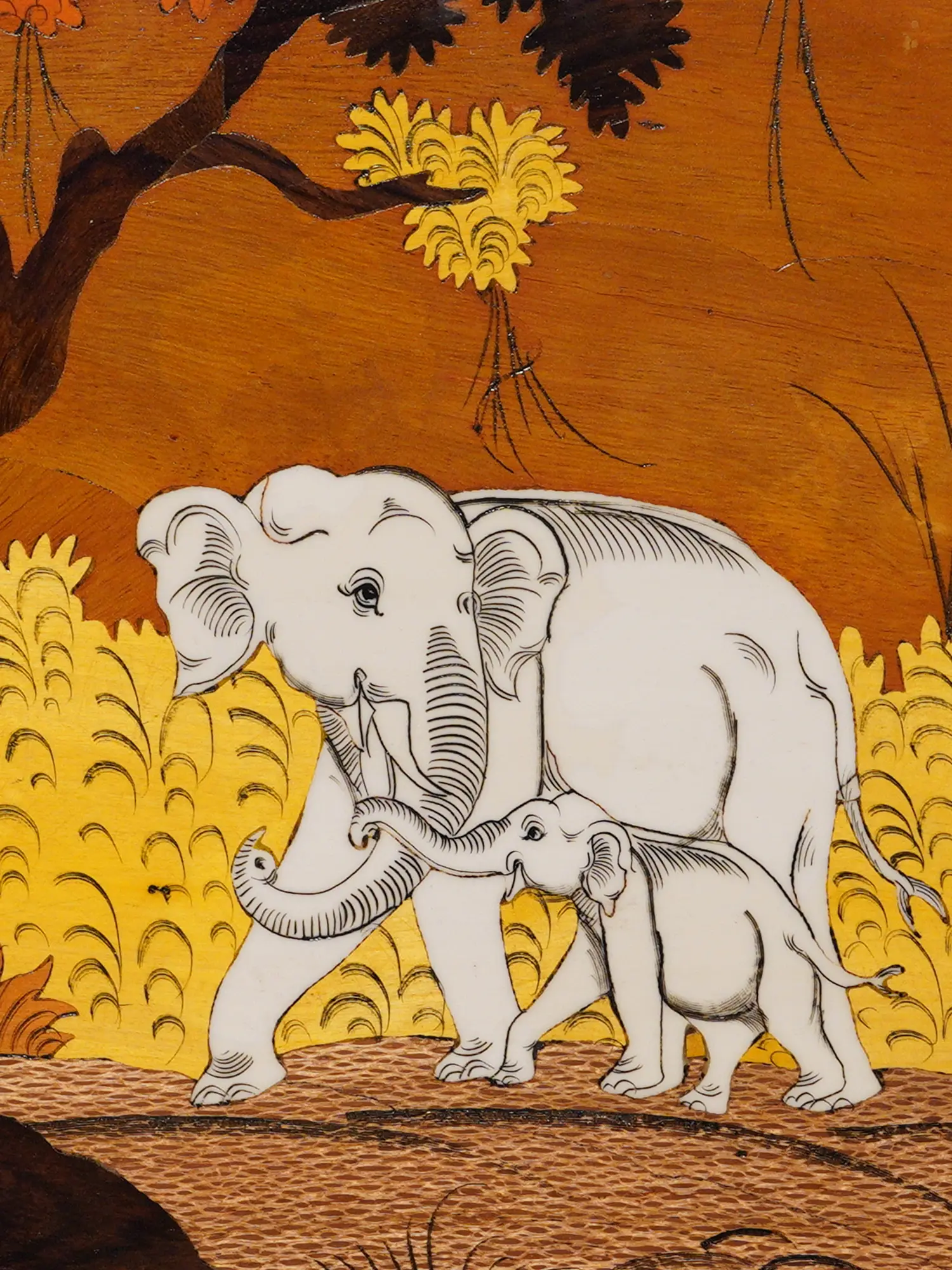 This exquisite piece, meticulously crafted from rosewood, presents a serene snapshot of family life within a lush forest setting. The rich, warm tones of the rosewood create a foundation for the intricate inlay work, bringing the scene to life with depth and vibrancy. Observe a mother elephant and her calf accompanied by an elder, perhaps another mother. The elephants are rendered in elegant detail, their majestic presence softened by the depiction of their familial bond. This artwork provides a glimpse into an idyllic existence, reminding us of the simple beauty of the natural world.