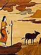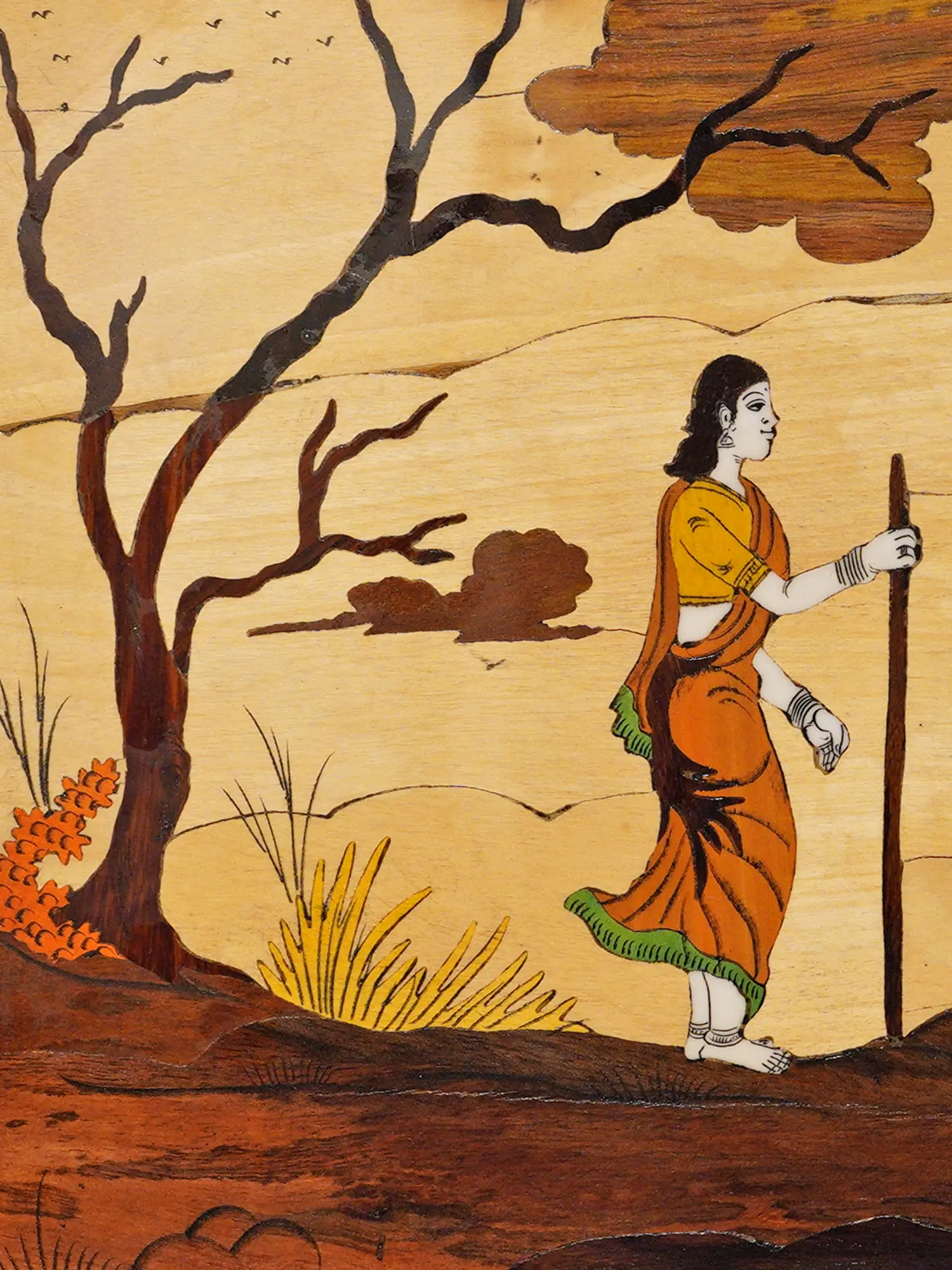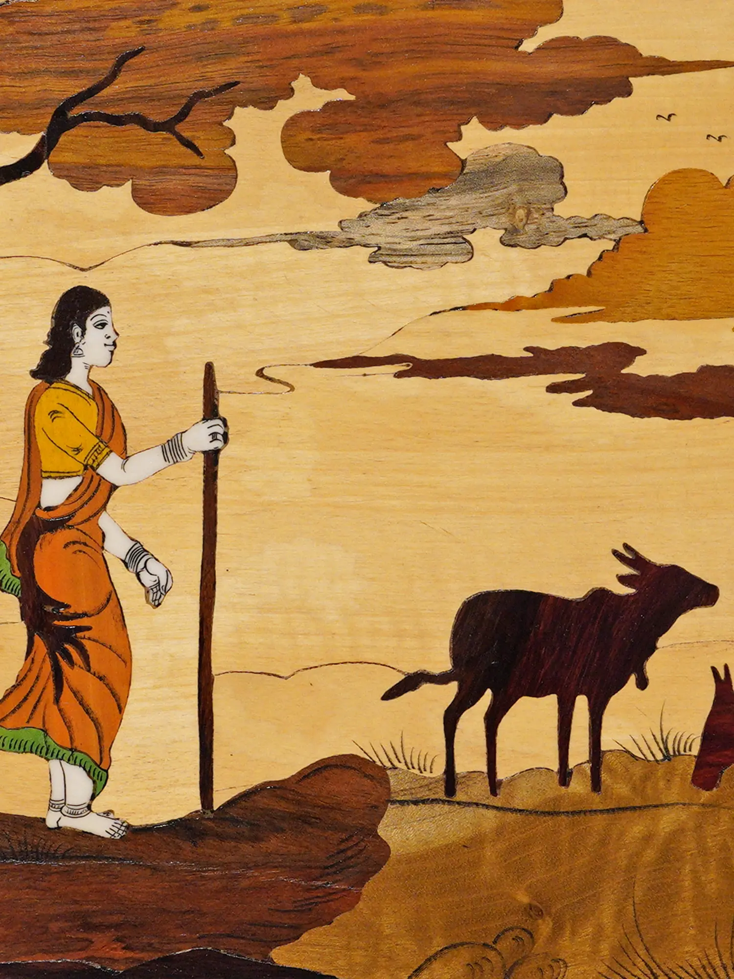15" Cowherding Lady | Natural Color on Wood Panel with Inlay Work