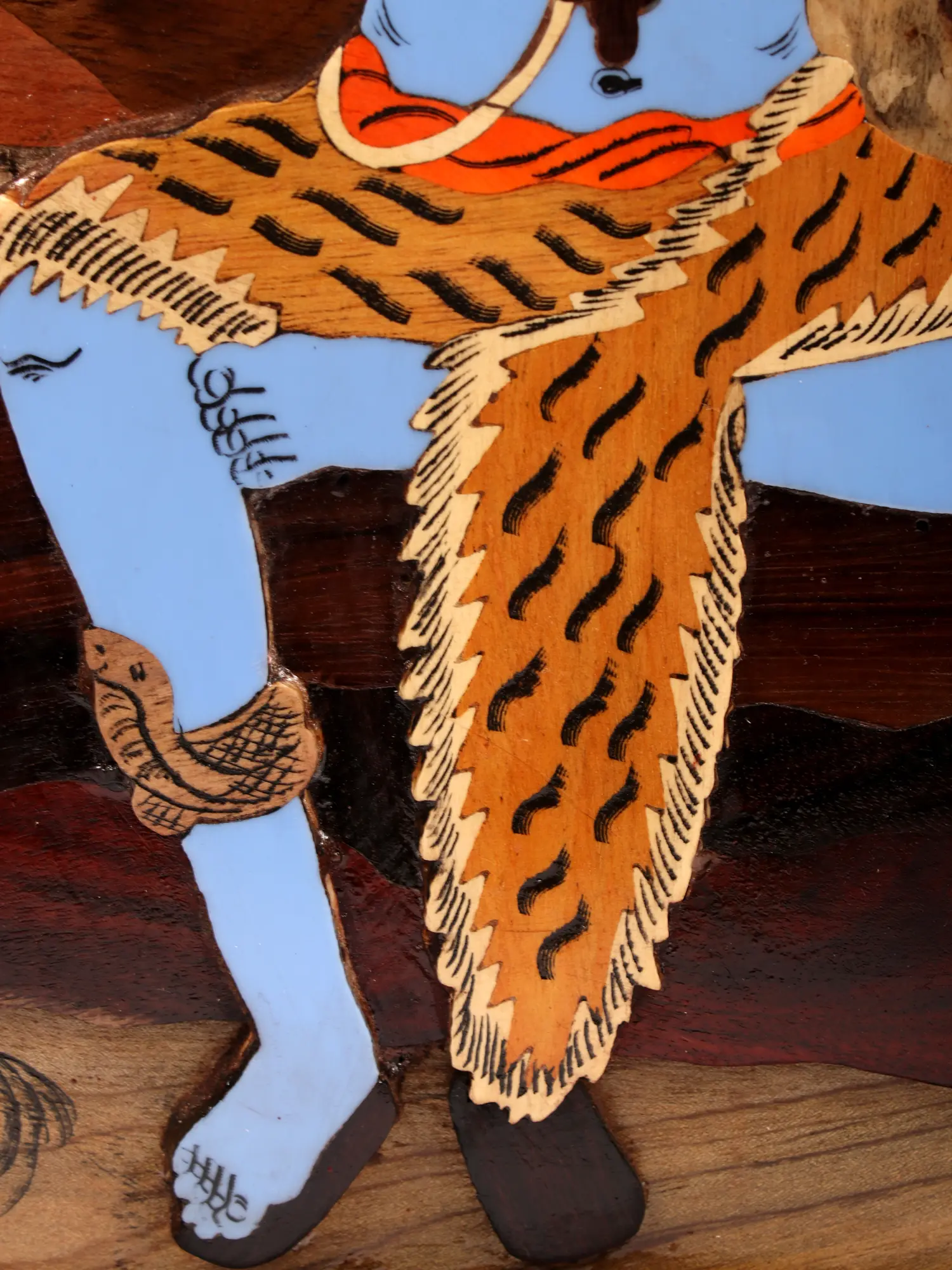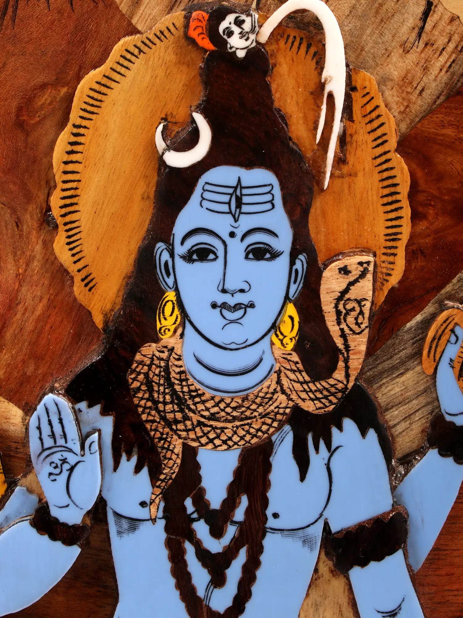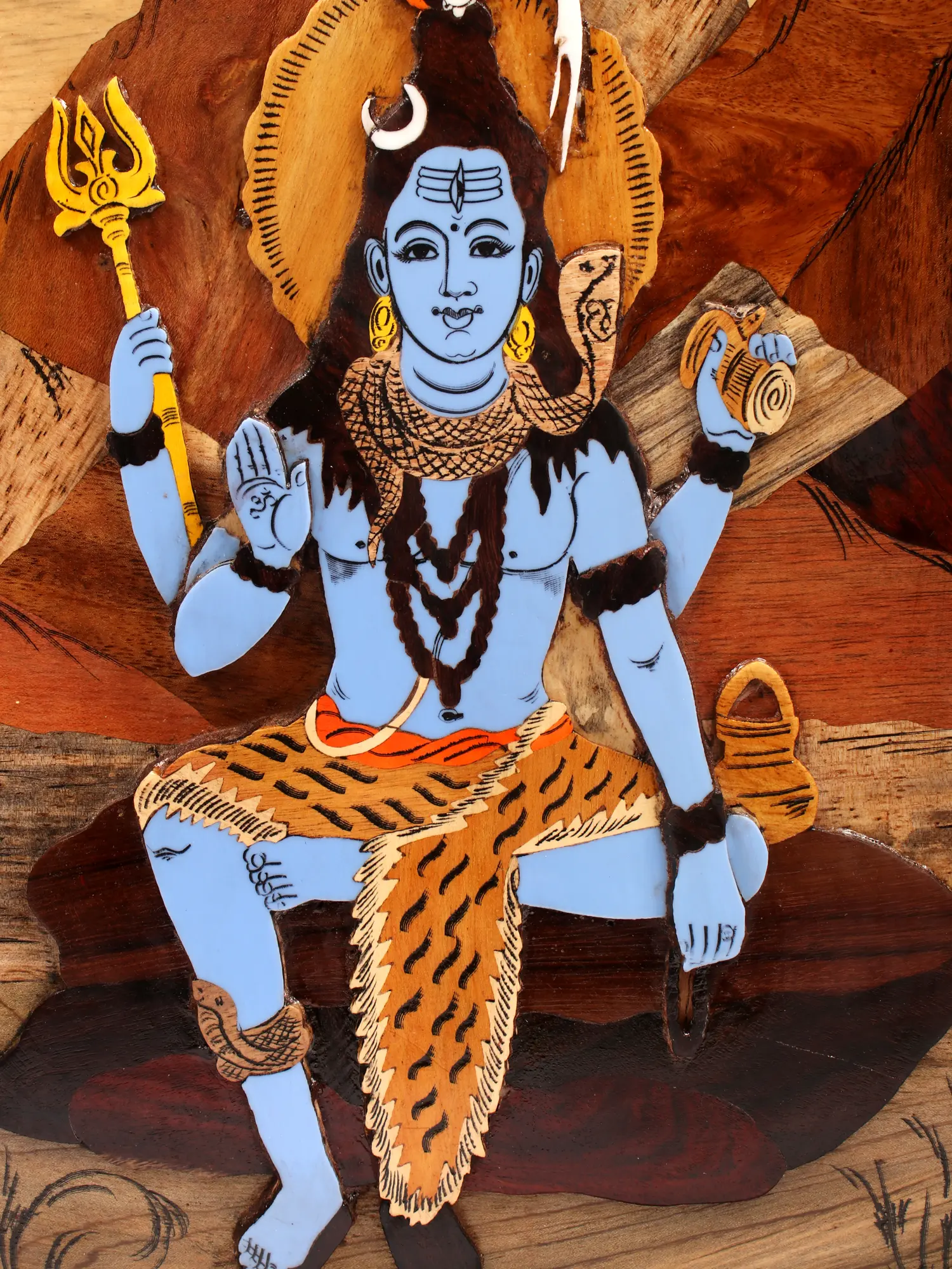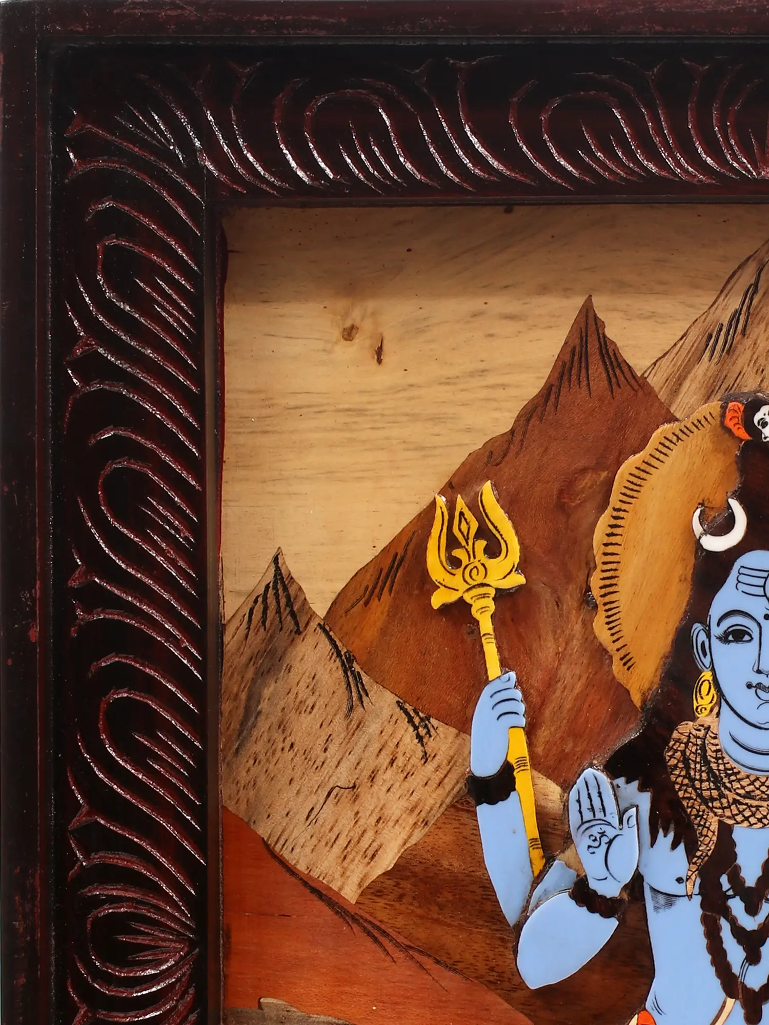 The inlay work of blue color on the body of Lord Shiva enhances the spiritual ambiance, the brown background allows the image of Lord Shiva to become even more vibrant. As a revered symbol of transcendence and cosmic balance, this artwork not only aesthetically celebrates Lord Shiva but also serves as a spiritual focal point, inviting contemplation and reverence.