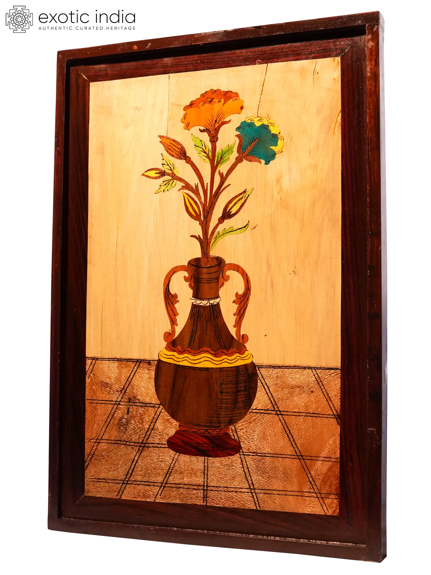 Immerse yourself in the rich tradition of Mysore wooden inlay with this exquisite panel. This is a craft deeply rooted in the history and culture of the Mysore region in Karnataka, India. The art form flourished under the patronage of the Wodeyar dynasty, the rulers of Mysore, who were great connoisseurs of art and culture. They encouraged skilled artisans from various parts of the country to settle in Mysore and practice their craft. This led to a synthesis of diverse artistic styles, resulting in the unique character of Mysore inlay work. The technique involves meticulously carving out sections of wood and then precisely fitting inlays of contrasting materials like ivory, sandalwood, rosewood, and even metal. The process is painstaking, requiring exceptional skill and patience. Artisans meticulously craft each element, ensuring a seamless and harmonious blend of colors and textures. The result is a stunning piece of art, where the interplay of light and shadow brings the design to life.
