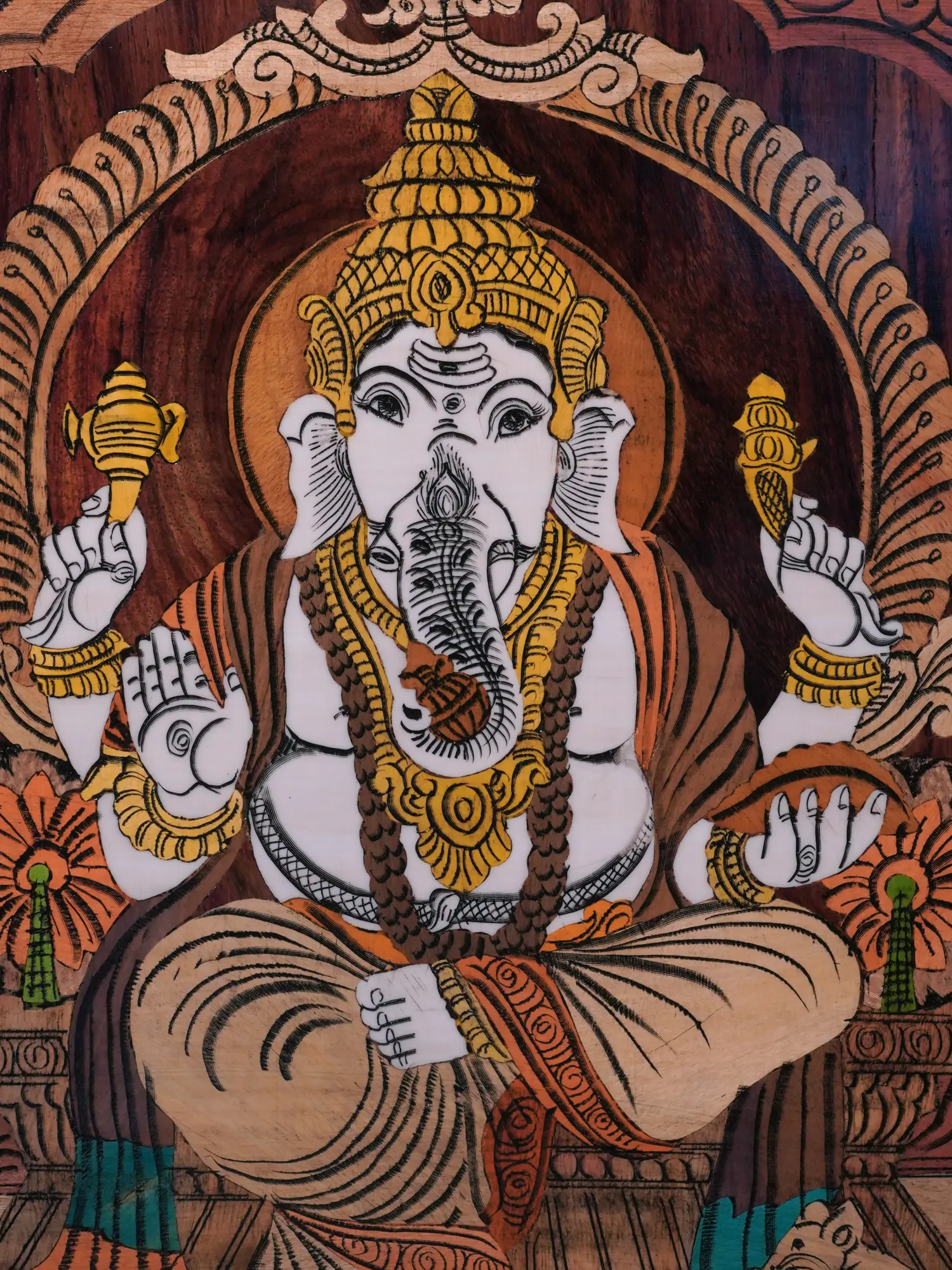 In Hindu tradition, no undertaking is commenced without first invoking the blessings of Lord Ganesha, the remover of obstacles and the bestower of success. He is revered as the embodiment of wisdom, prosperity, and good fortune, and his presence is considered auspicious for any new venture, project, or stage in life. This beautifully crafted wooden panel captures the essence of Lord Ganesha's benevolent nature, portraying him seated majestically on his throne, ready to grant blessings to all who seek his grace. The image presents Ganesha in a serene and contemplative pose, his gentle eyes radiating compassion and wisdom. His elephant head symbolizes intellect and the power of discrimination, while his large ears signify his attentiveness to the prayers and needs of his devotees. The modak, or sweet dumpling, in his hand represents the sweetness of spiritual realization, reminding us to savor the divine essence within ourselves. The other hand is in the blessing gesture.