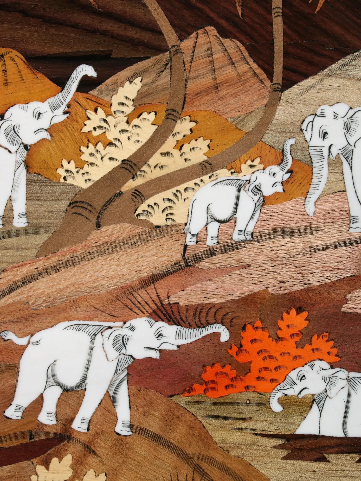 The composition unfolds across a generous 19.3-inch square, offering a substantial presence without overwhelming your décor. You'll appreciate the interplay of light and shadow created by the natural wood colors, highlighting the curves of the elephants and the rugged contours of the mountains and trees. The 1-inch depth ensures a robust and tactile quality, inviting closer inspection of the intricate inlay work. The white elephants, rendered in their natural, unadorned hue, stand out with a luminous purity against the earthy tones of their surroundings.