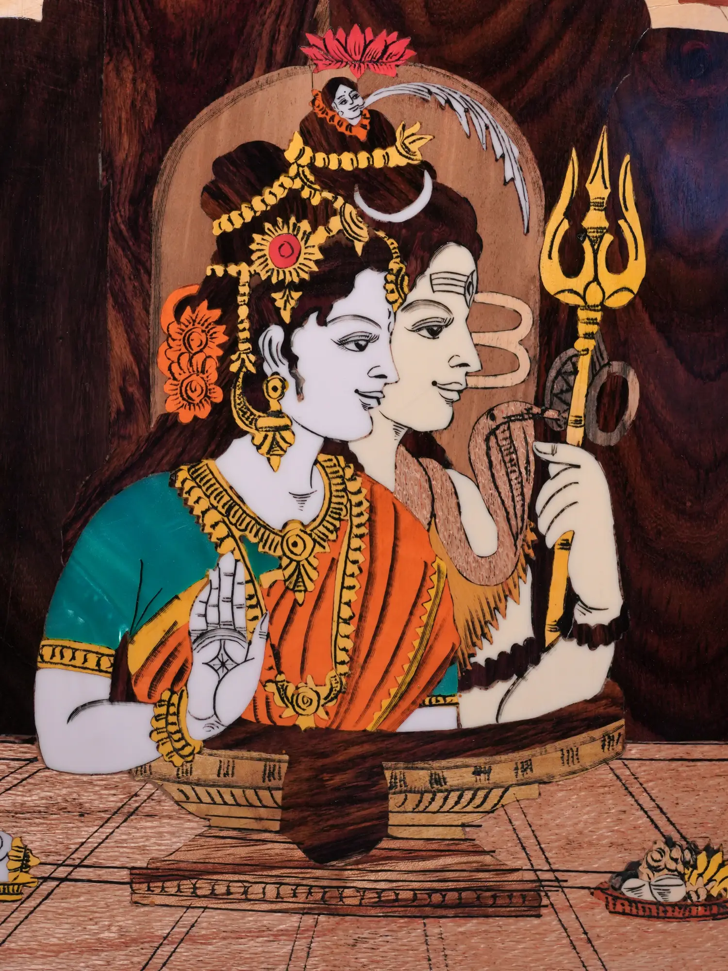 The artwork itself captures Shiva and Parvati in an intimate pose, side by side, each radiating a gentle radiance. The intricate inlay work showcases the careful precision and skill of the artisan. The natural color palette adds to the beauty of the wood and emphasizes the divine presence of the deities. The scene is framed by an archway, suggesting a sacred space. Offerings of fruit and flowers rest before them, underscoring the theme of devotion. Each detail, from the delicate facial features of Shiva and Parvati to the floral ornamentation that surrounds them, has been lovingly crafted to create a visual experience that invites contemplation. The wooden base offers a solid foundation for the intricate inlay. This artwork is not only an aesthetic masterpiece but also a window into the rich tapestry of Hindu mythology and spirituality. Displaying this piece in your home or sacred space creates an atmosphere of serenity and allows you to connect with the powerful symbolism of Shiva and Parvati.
