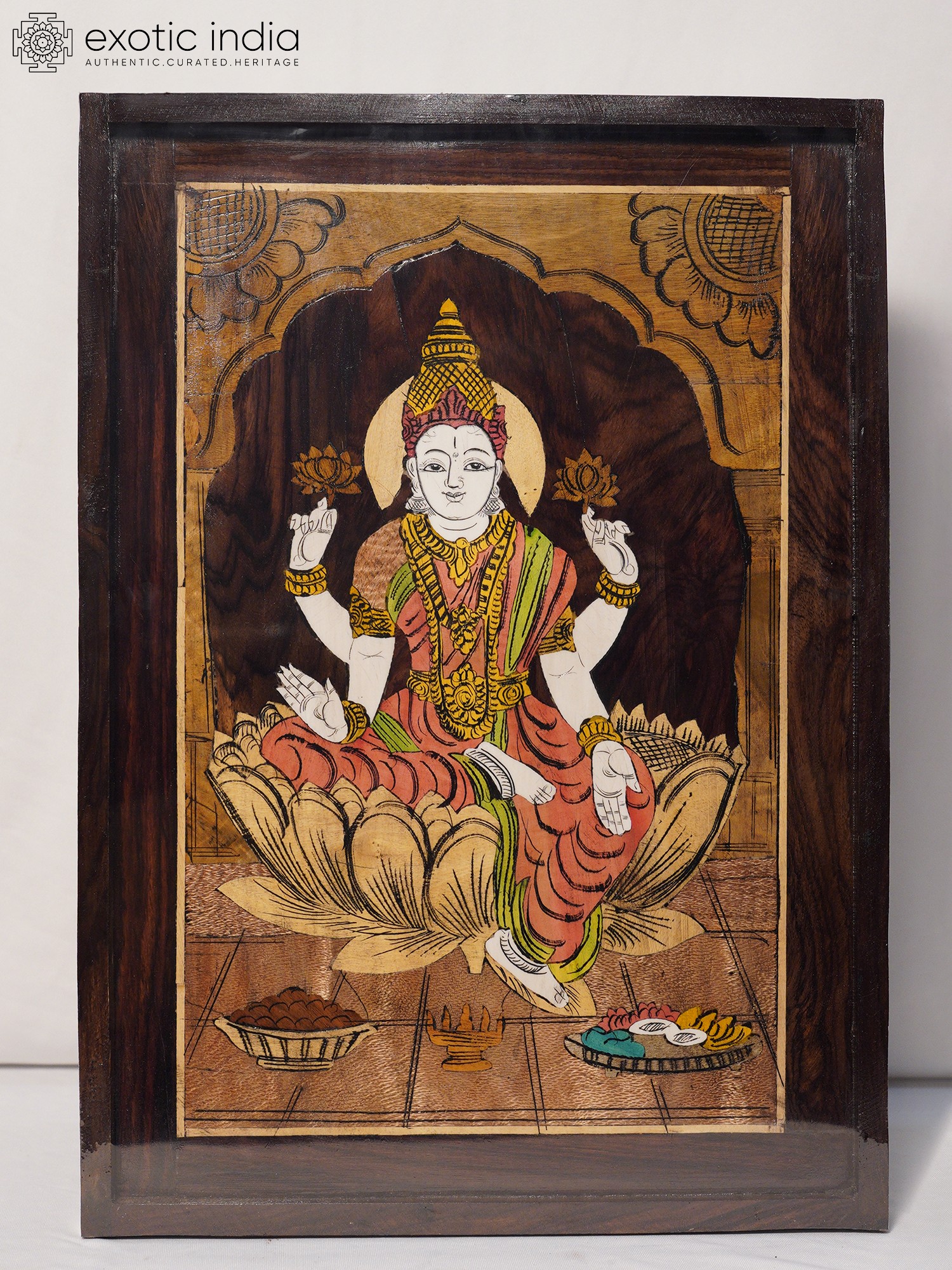 18" Goddess Lakshmi Seated on Lotus | Natural Color on Wood Panel with Inlay Work