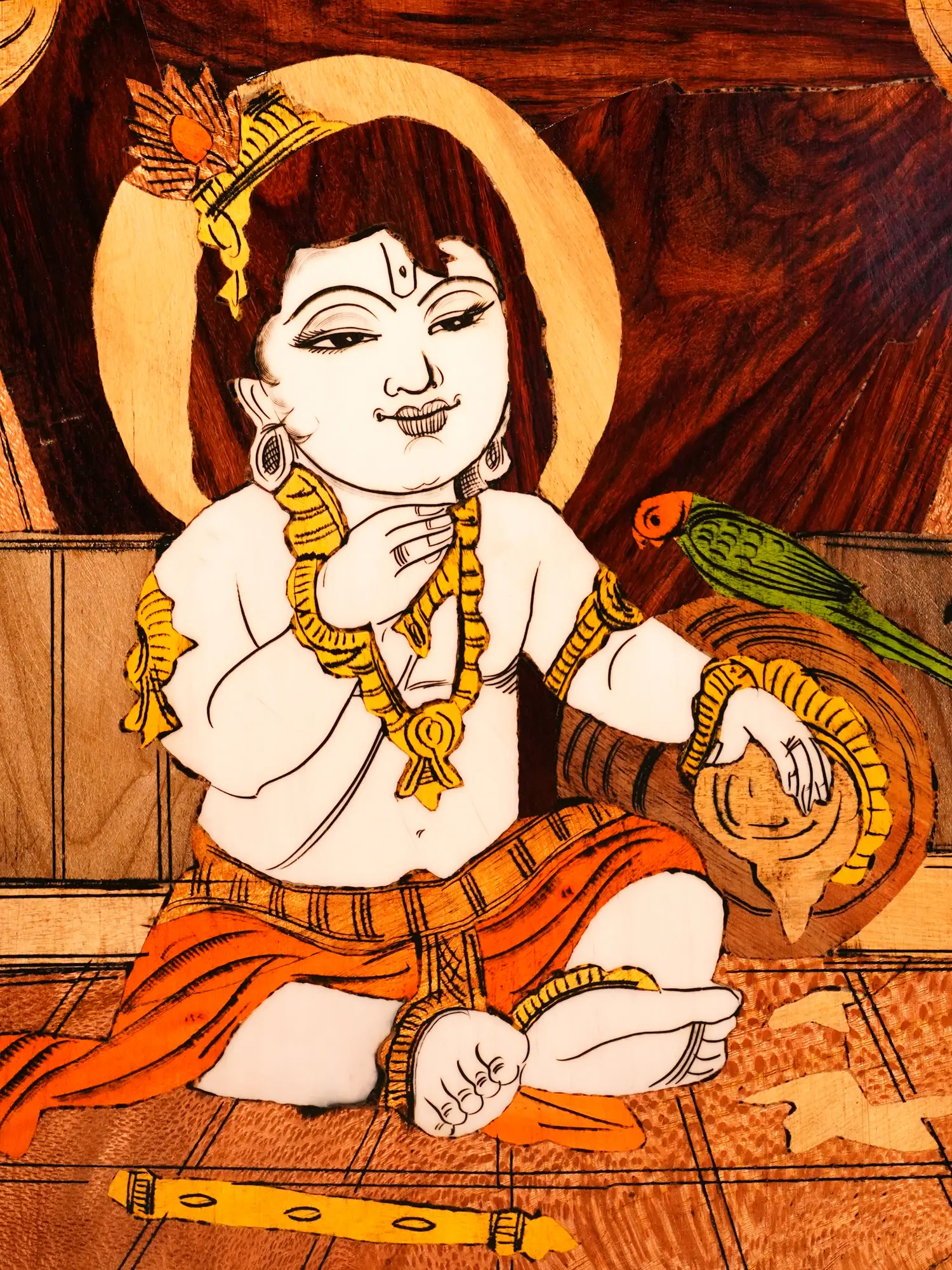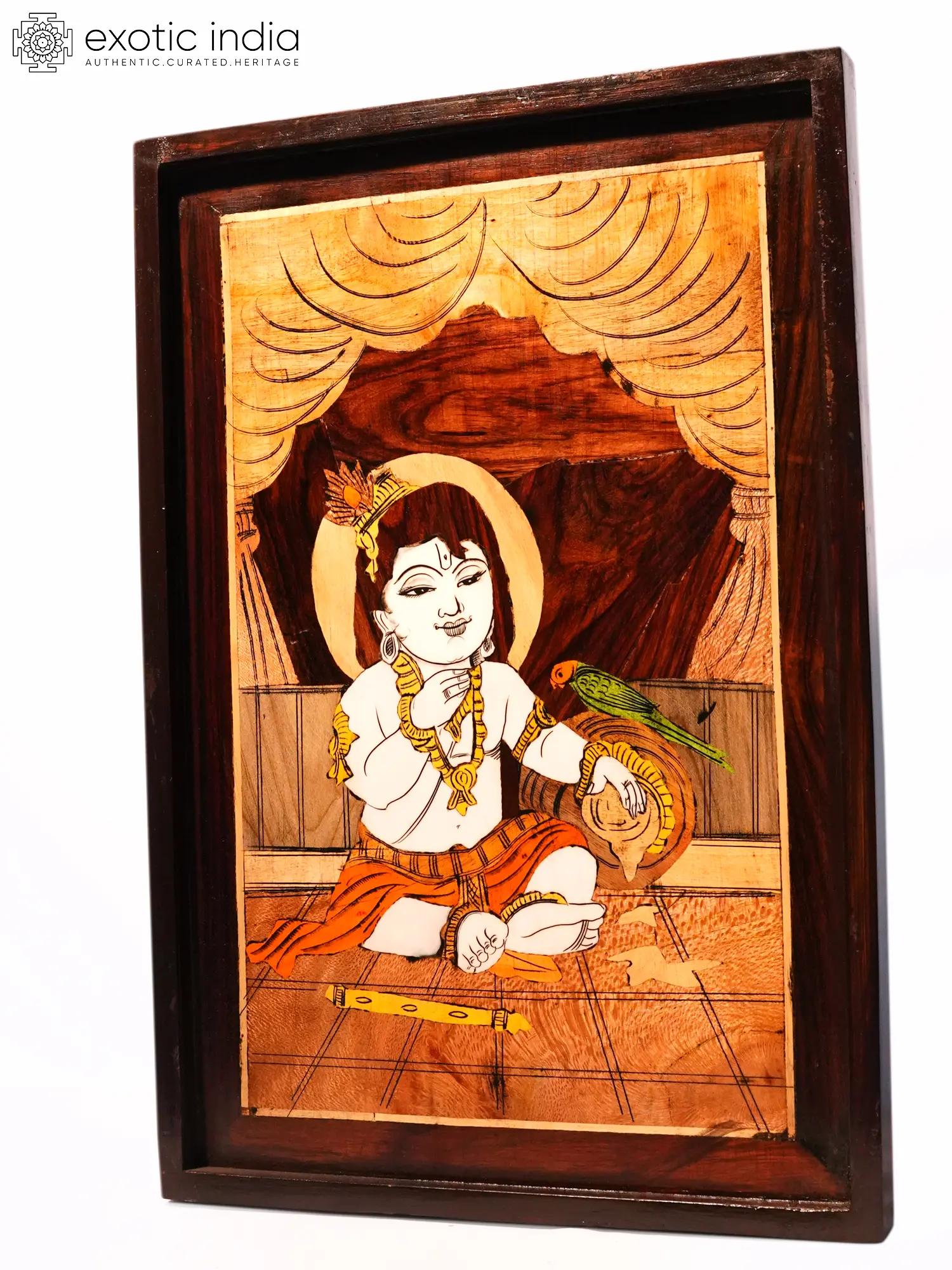 19" Little Krishna Playing With Parrot | Natural Color On Wood Panel With Inlay Work