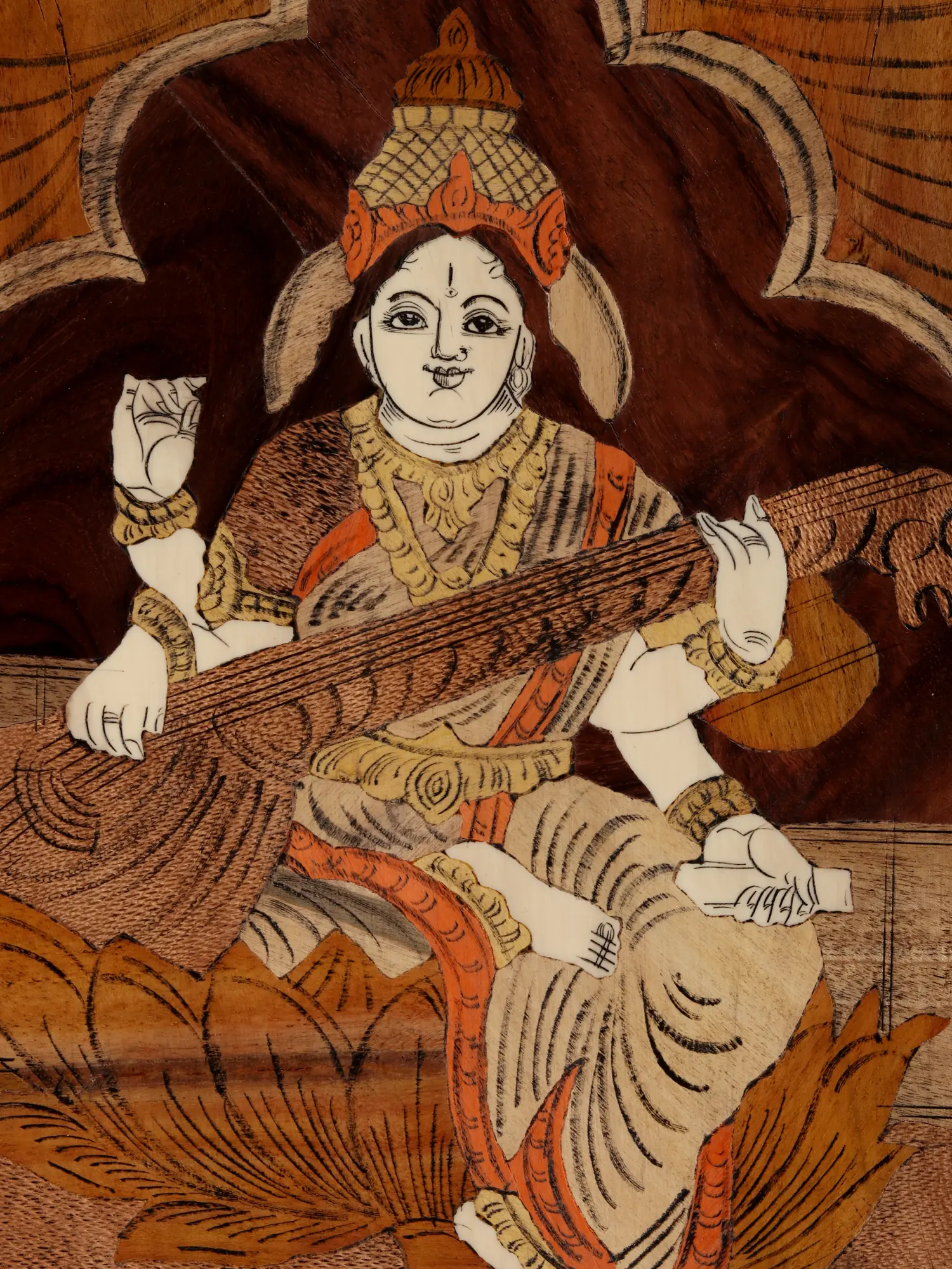 19" Seated Goddess Saraswati On Lotus | Natural Color On Wood Panel With Inlay Work