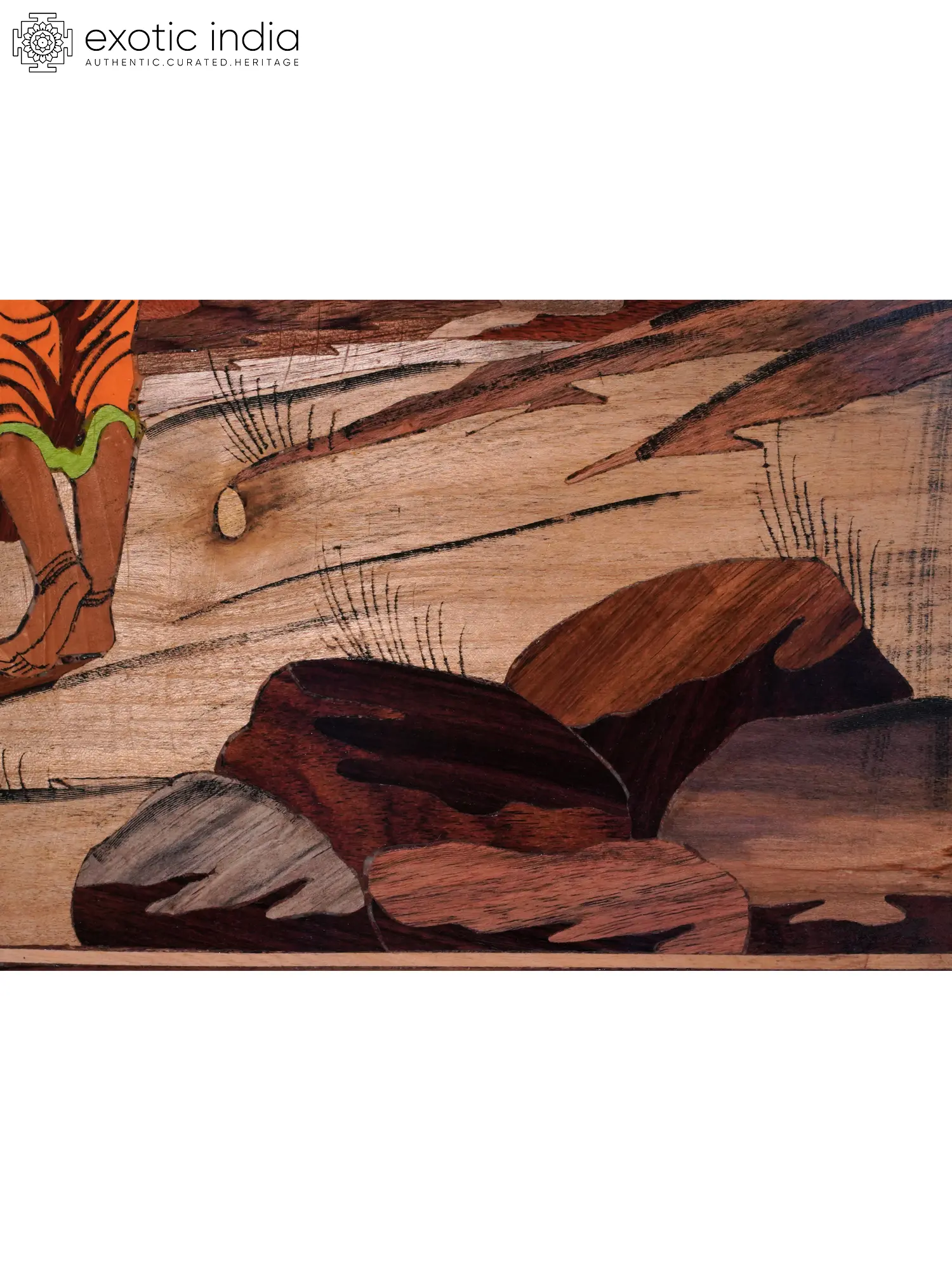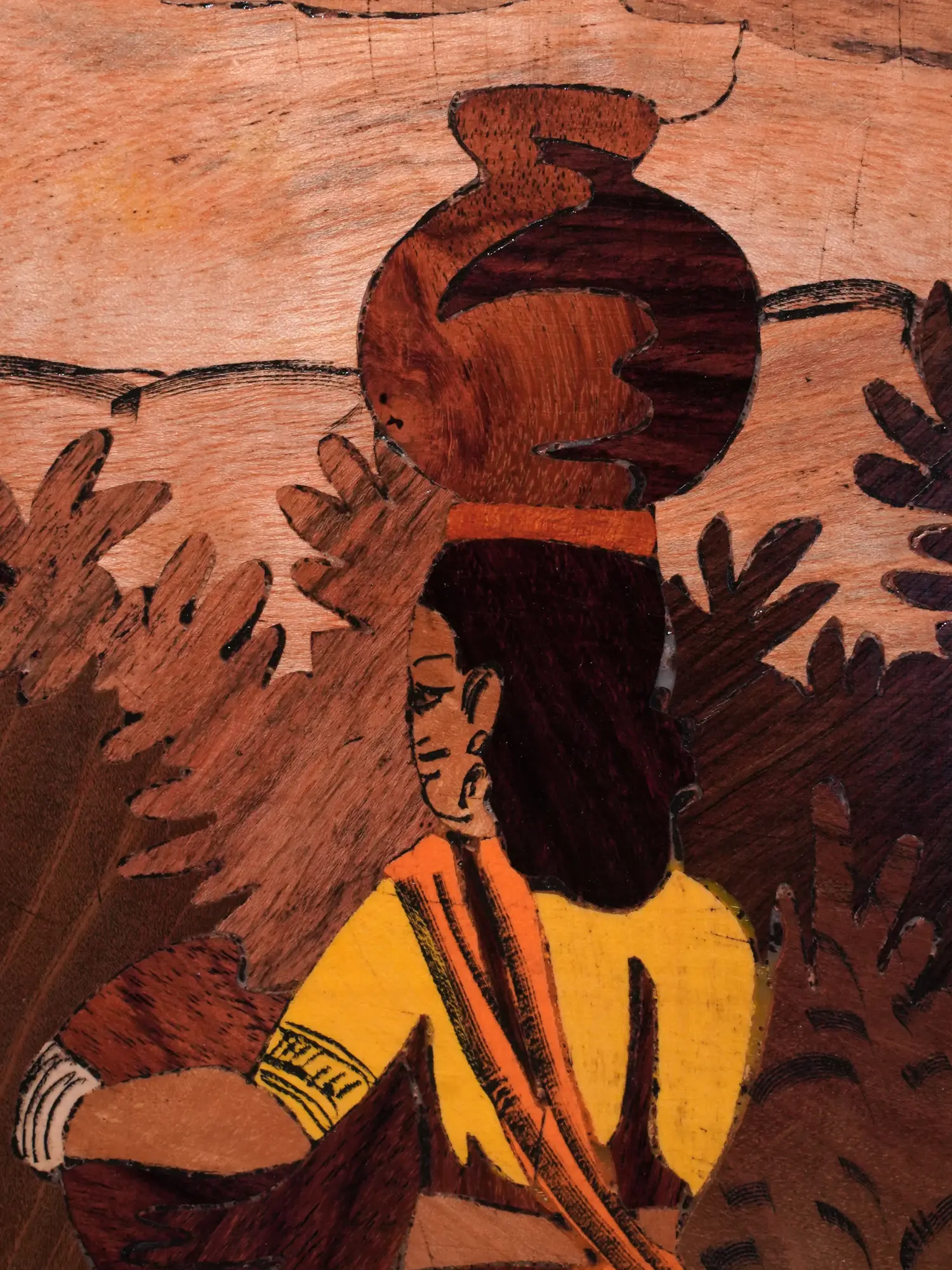 This stunning wooden panel is a testament to the enduring legacy of Mysore inlay, a traditional art form that has graced palaces and homes across India for centuries. The technique, known for its meticulous detail and intricate use of diverse materials, transforms simple wood into vibrant scenes of daily life, mythology, and nature. The practice flourished under the patronage of the Mysore Wodeyars, who not only commissioned elaborate works but also actively promoted the art form through workshops and training centers. Today, it continues to be a prized possession and a symbol of India's rich artistic heritage.