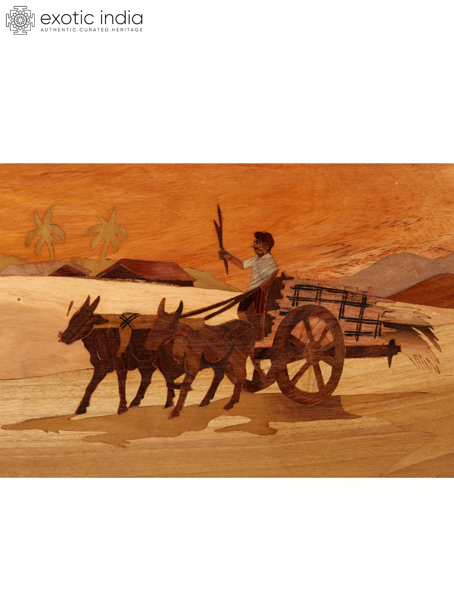 This work is deeply rooted in the artistic traditions of Mysore, renowned for its intricate wood inlay and marquetry. For centuries, artisans in this region have transformed simple wooden surfaces into canvases of breathtaking beauty. This particular depiction of a loaded bullock cart carrying goods is a classic motif, representing sustenance, travel, and the enduring spirit of rural communities across India.