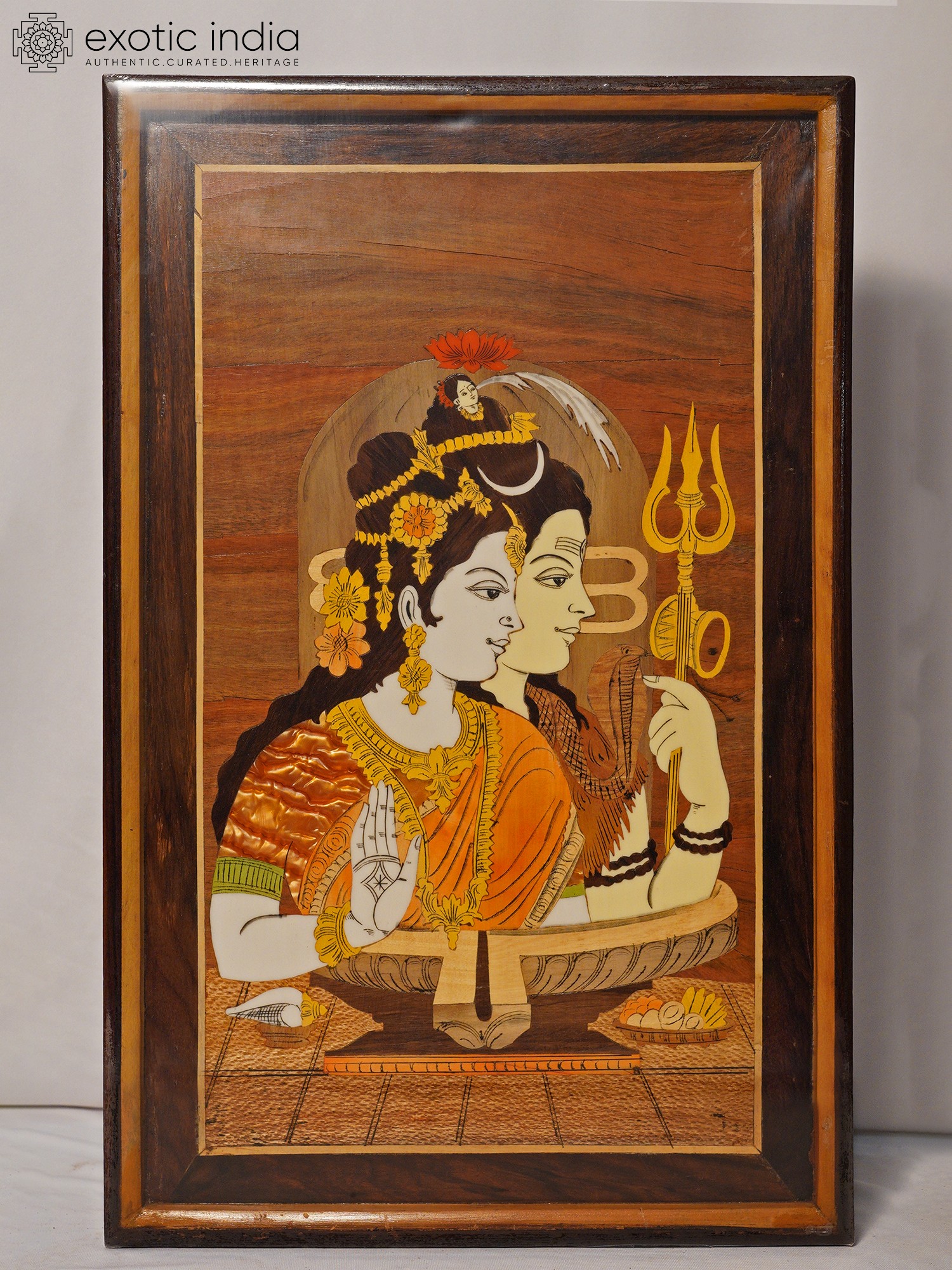 36" Lord Shiva And Goddess Parvati | Natural Color On Inlay Wood Panel
