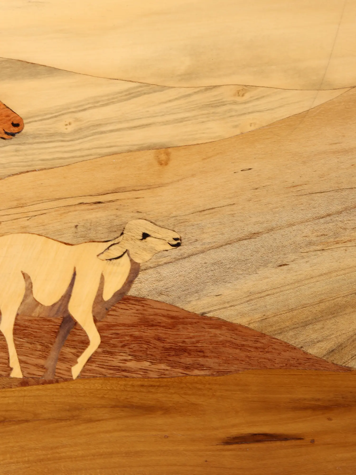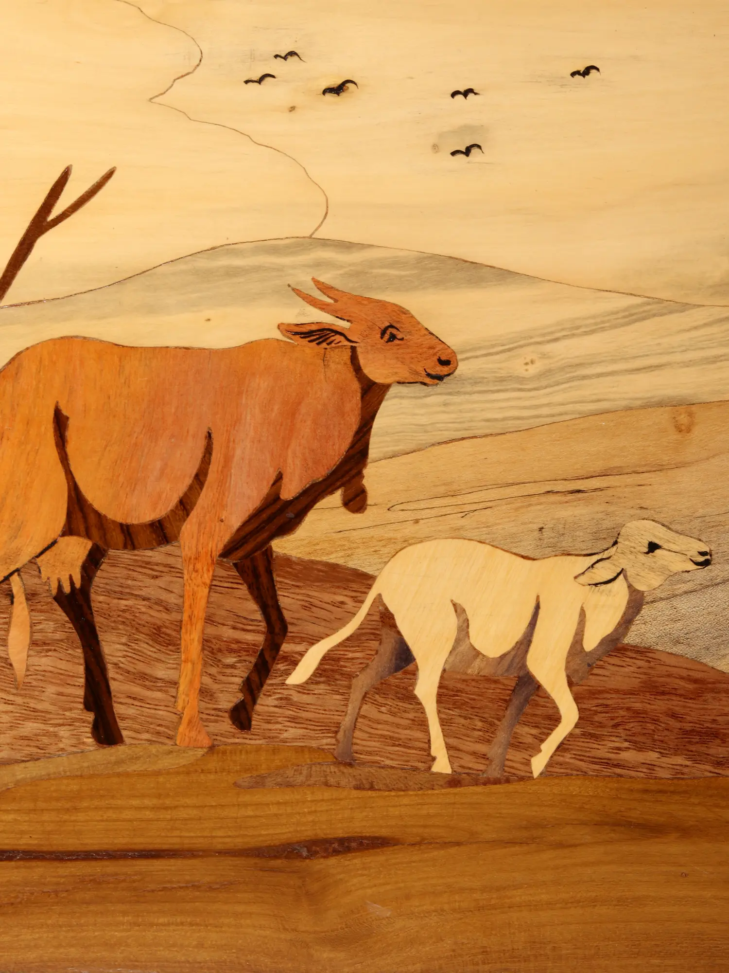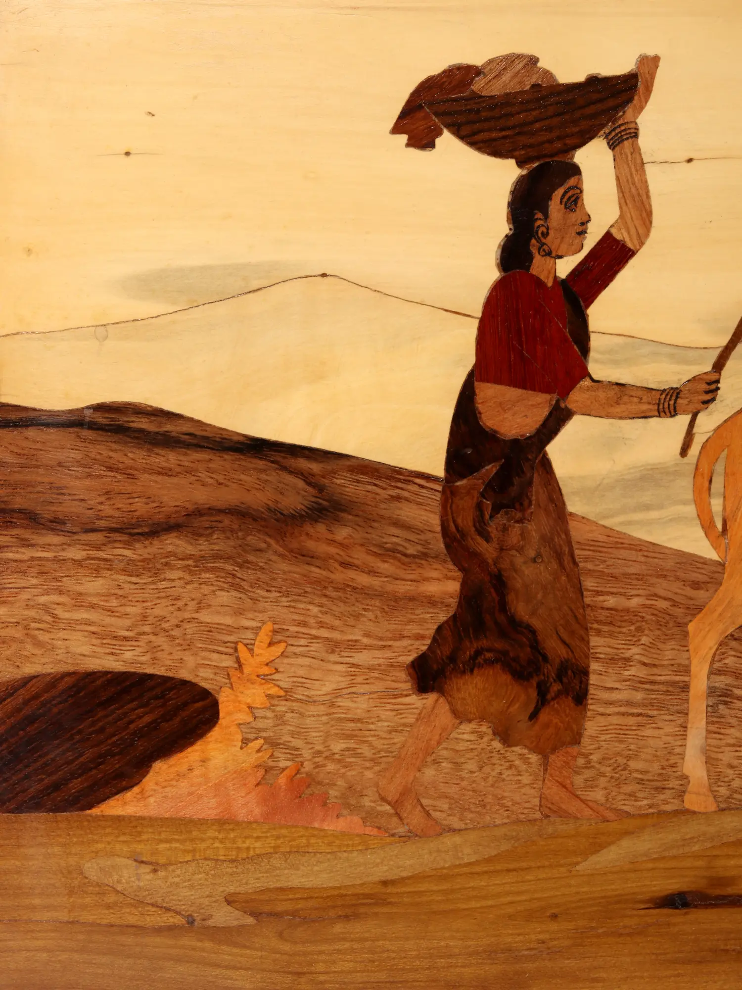 Each element of this artwork is a testament to masterful craftsmanship, born from the traditional techniques of Mysore wood inlay. Skilled artisans have painstakingly selected and arranged numerous pieces of natural wood, each with its own unique grain and hue, to compose this evocative tableau. The subtle variations in color and texture are not merely decorative; they are integral to the artistry, lending depth and realism to the figures and their surroundings. The warm, inviting tones of the natural wood speak of the earth and the life it sustains, while the intricate inlay work showcases a dedication to detail passed down through generations.