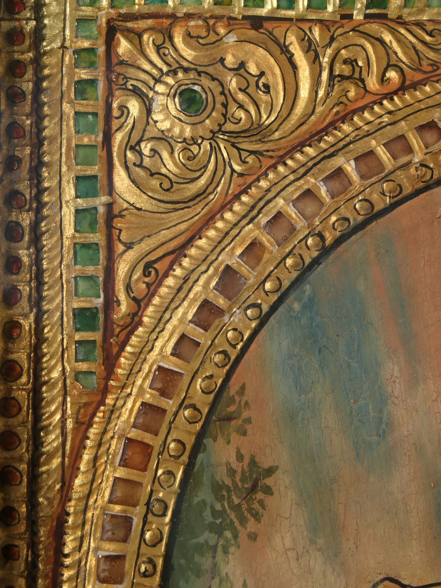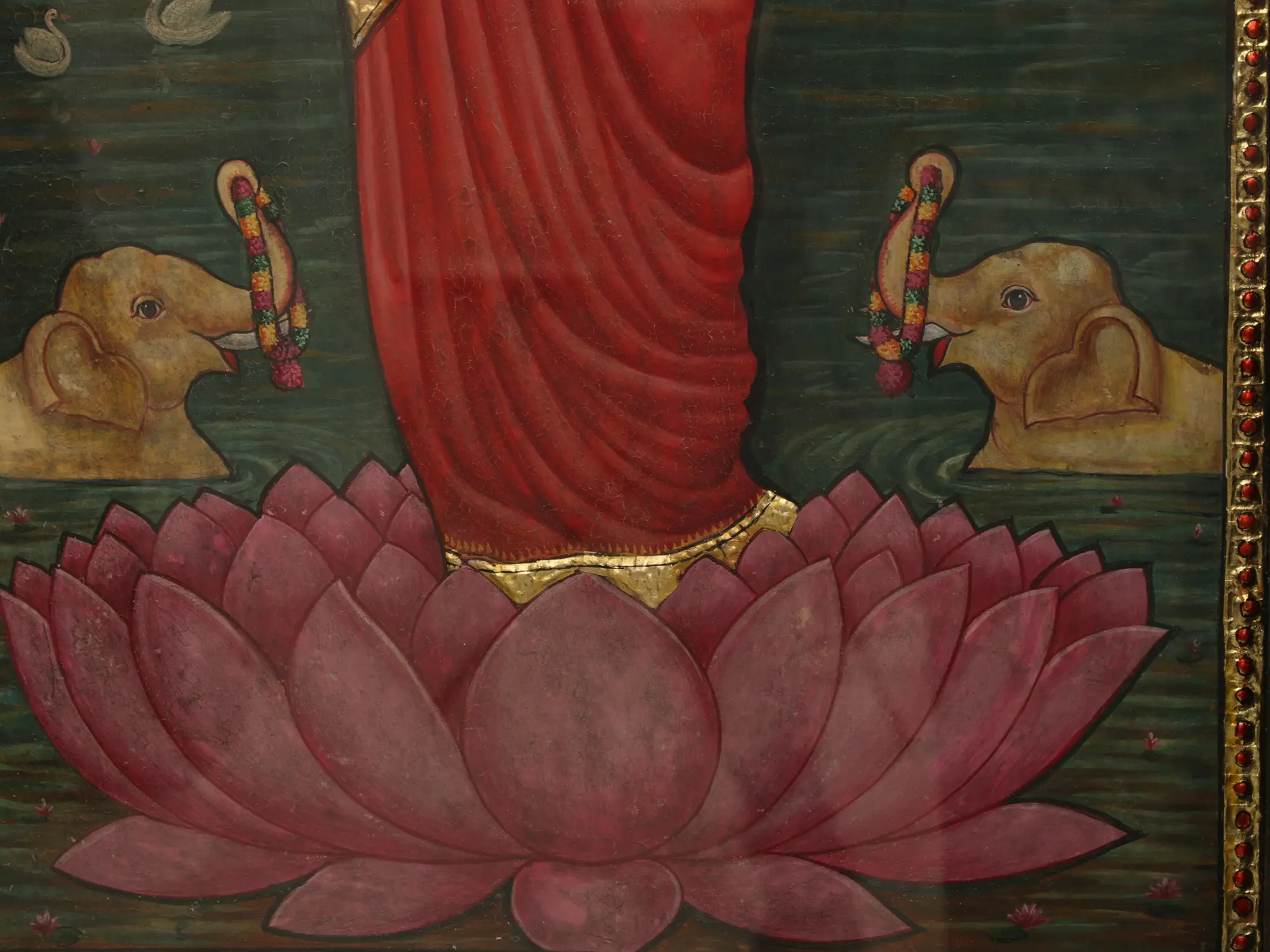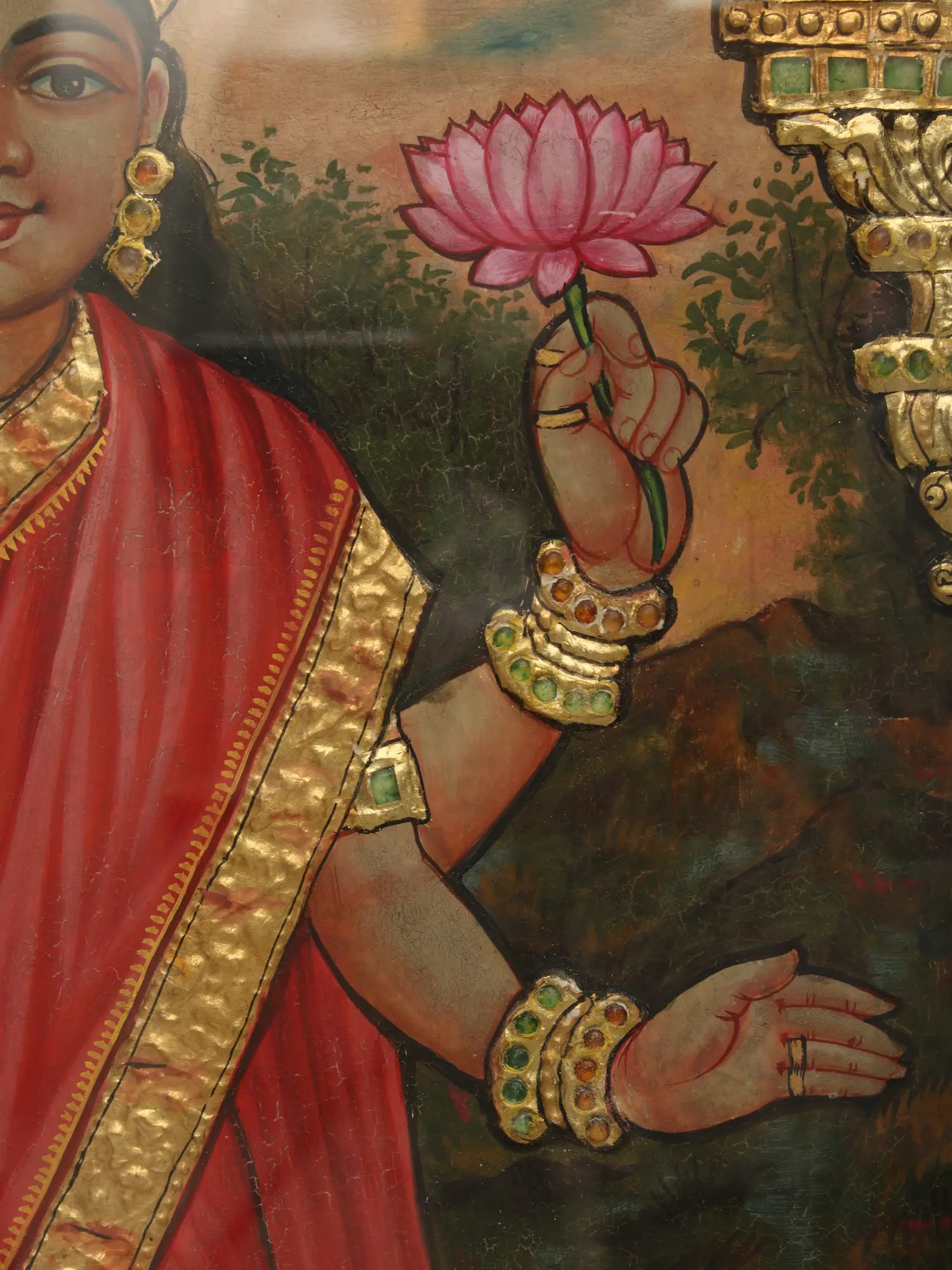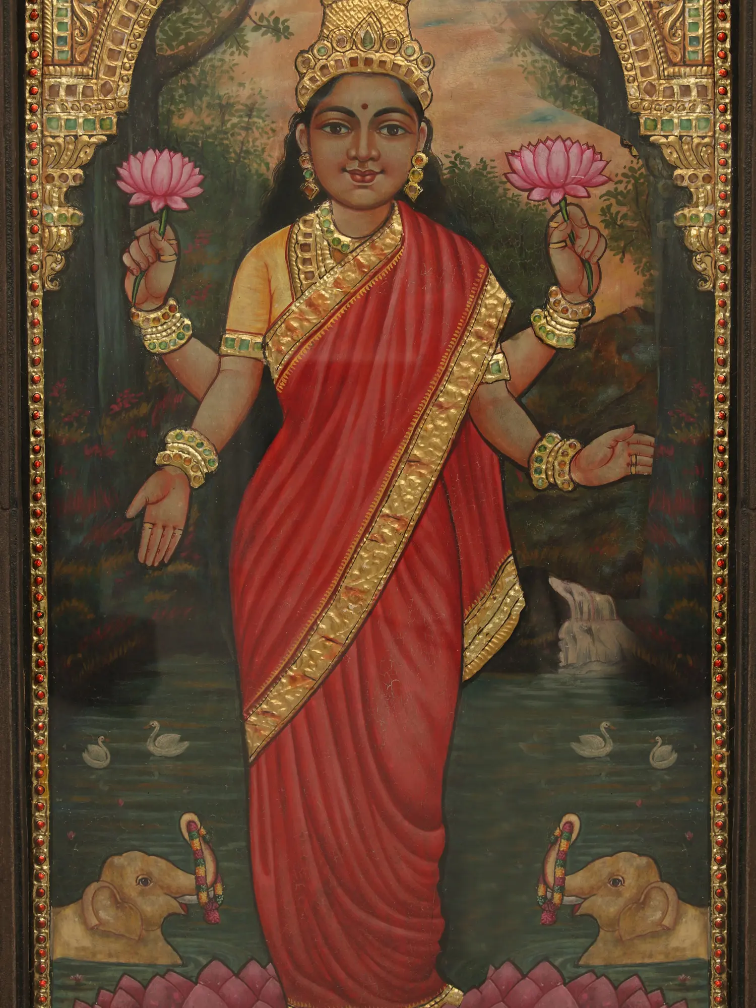 Gaze upon the divine form of Maa Lakshmi, the goddess of wealth, prosperity, and purity. She stands upon a delicate pink lotus, her ethereal presence radiating serenity and abundance. Every detail of her form, from the delicate jewellery gracing her divine limbs to her graceful saree has been painted with realism. the warm embrace of gold leaf and foil, Maa Lakshmi's form gleams with an otherworldly luminescence.