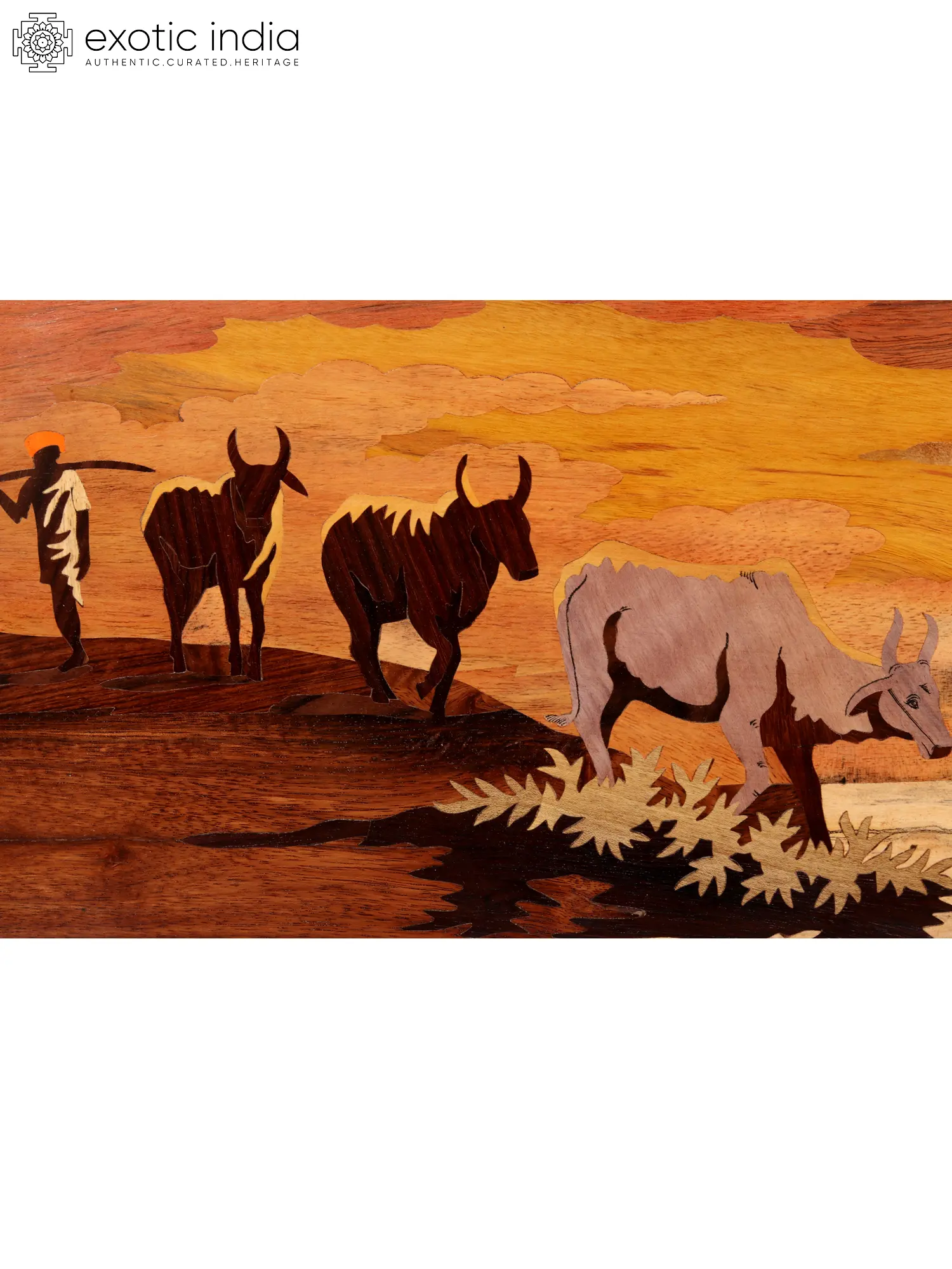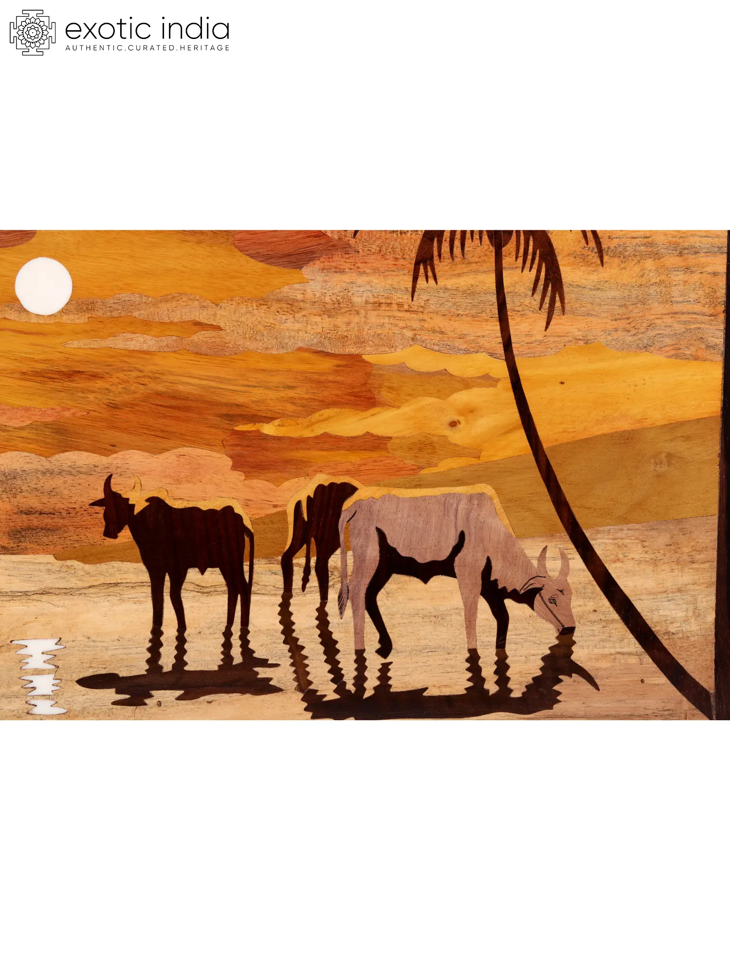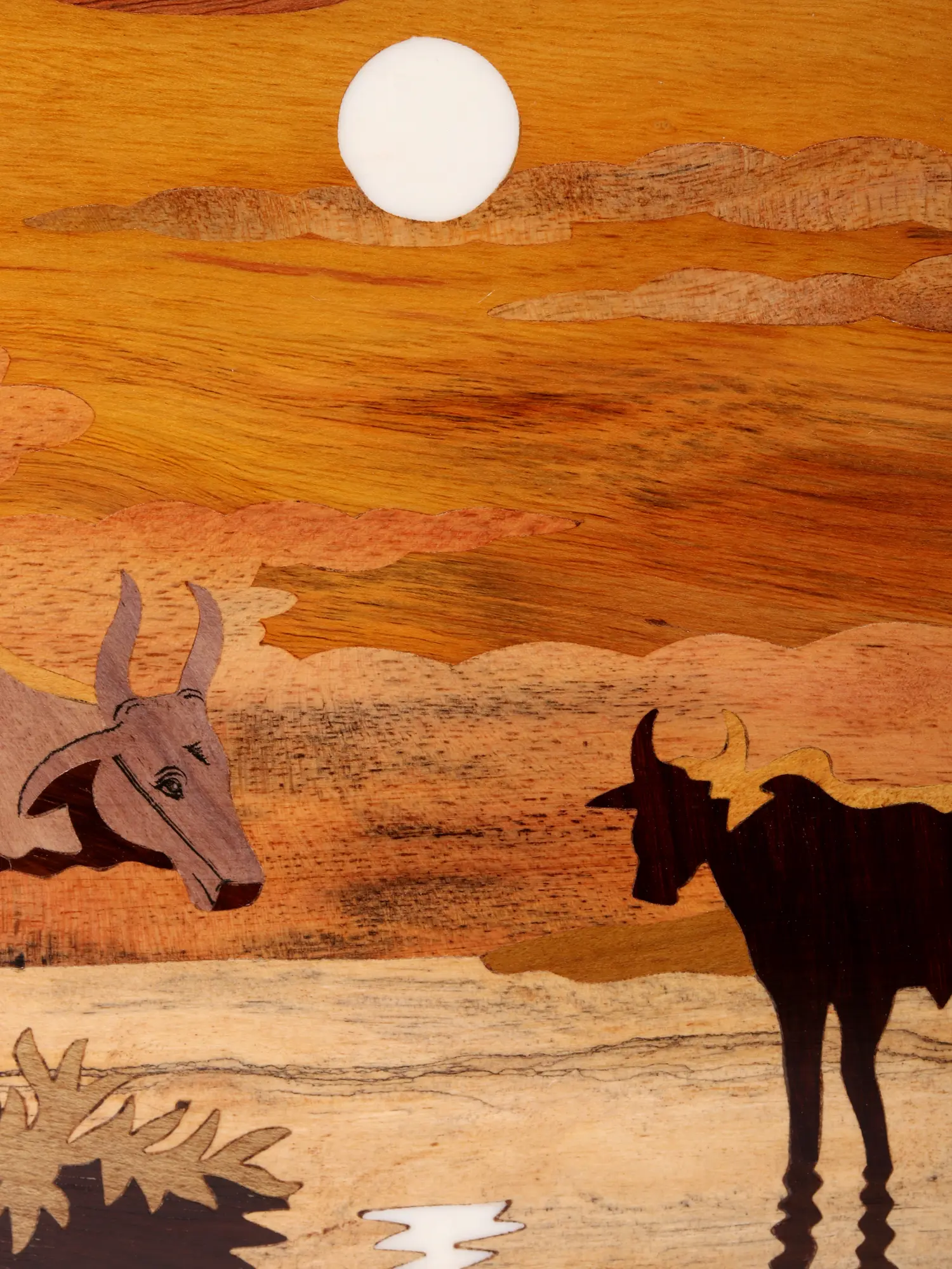 The expansive 28-inch width of this panel allows for a truly immersive viewing experience, complemented by a height of 15 inches that ensures it commands attention. The natural colors of the wood are expertly blended to depict the fiery hues of sunset, the subtle shades of the landscape, and the distinct silhouettes of grazing cattle. The subtle shimmer of inlaid materials catches the light, adding a layer of depth and dimension that elevates the entire composition.
