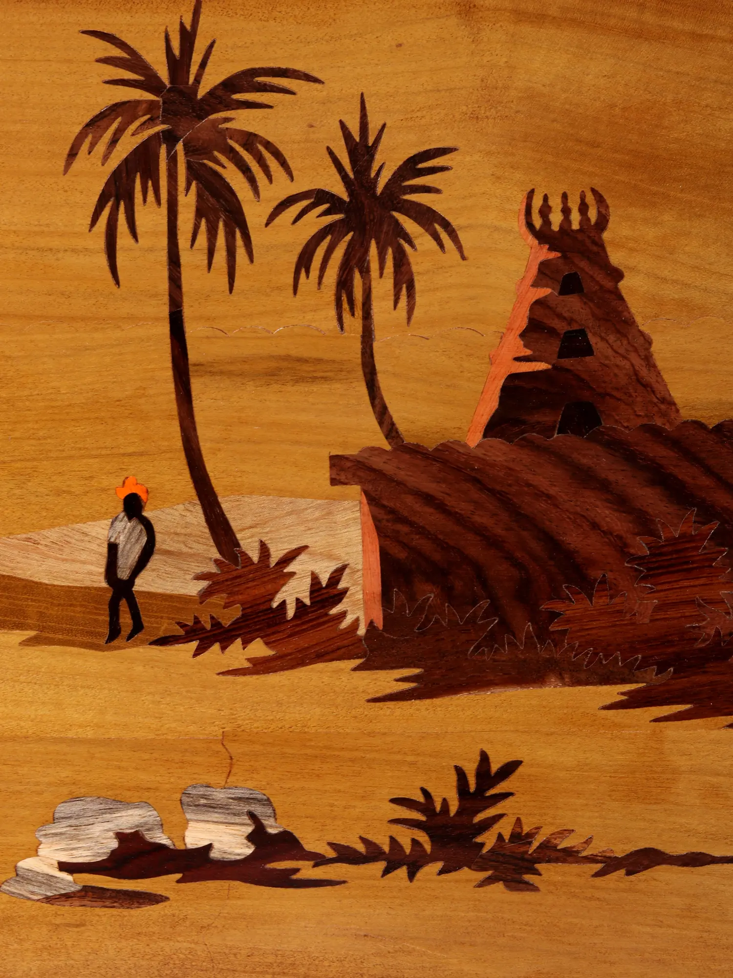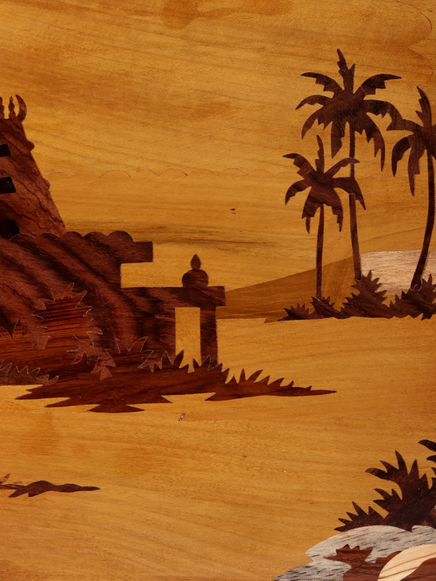 Crafted with meticulous attention to detail, this work showcases the ancient art of wood inlay. Natural wood veneers, selected for their unique grains and rich, earthy tones, are skillfully cut and fitted to form a vibrant tableau. The warm hues of the central panel, a testament to the natural color of the wood itself, are framed by a border of darker, lustrous wood, creating a sophisticated contrast that highlights the intricate artistry within.