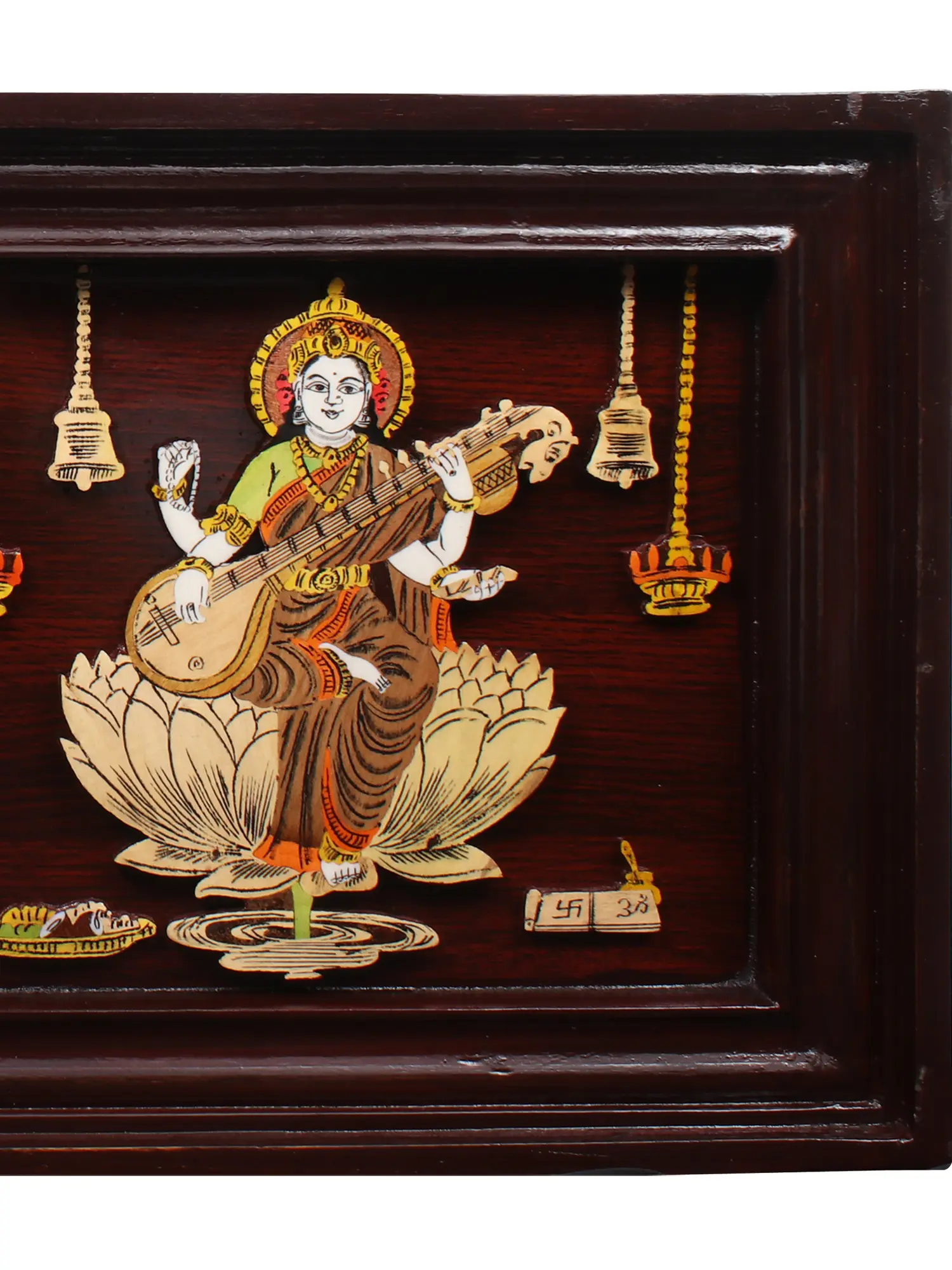 30" Beautiful Painting Of Lakshmi Ganesha And Saraswati | Natural Color On 3D Wood Painting With Inlay Work
